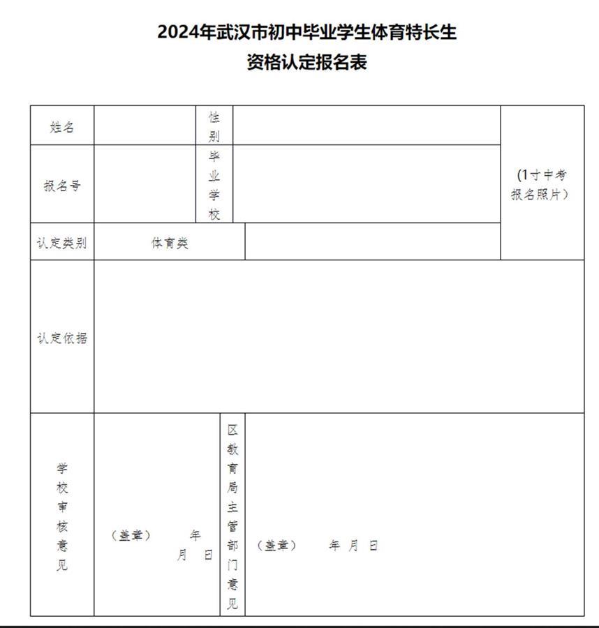 2024年武汉市初中毕业学生体育特长生资格认定报名表