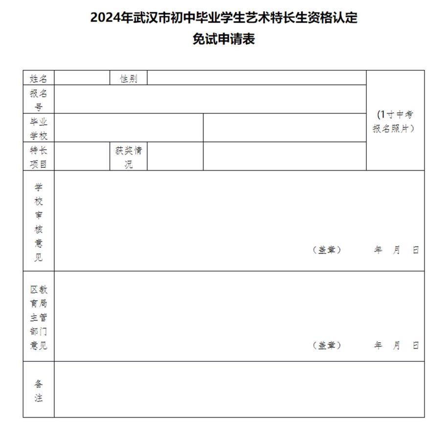凡符合免试条件的学生在本校或区教育局体卫艺站(中心)申请免试,填写《2024年武汉市初中毕业学生艺术特长生资格认定免试申请表》并附1寸登记照(中考报名照片)。各区对免试资格进行审核,于4月11日前将免试学生信息录入特长生免试总表发送到市教育局体卫艺处邮箱,于4月16日将特长生免试总表(纸质盖章版)和所有免试申请表原件报市教育局审核备案。