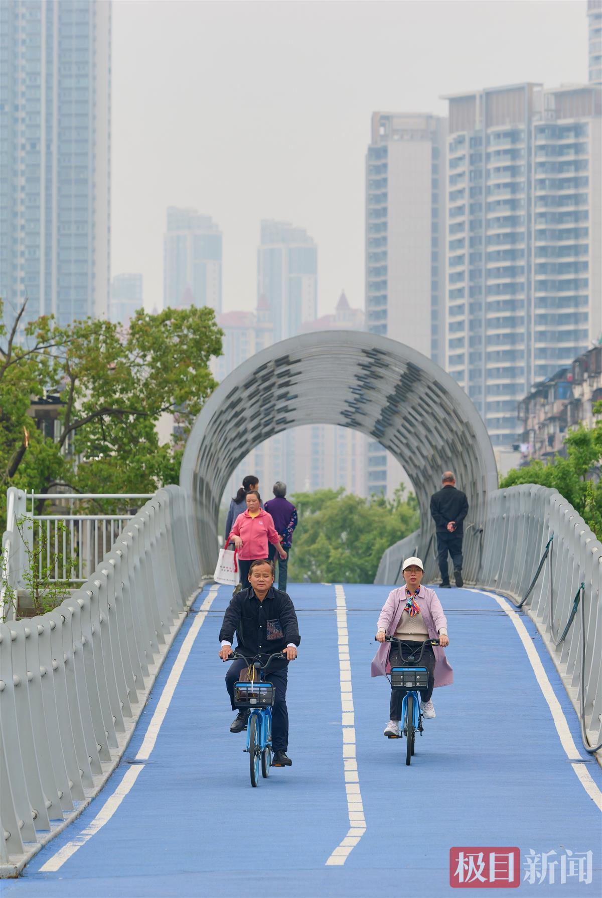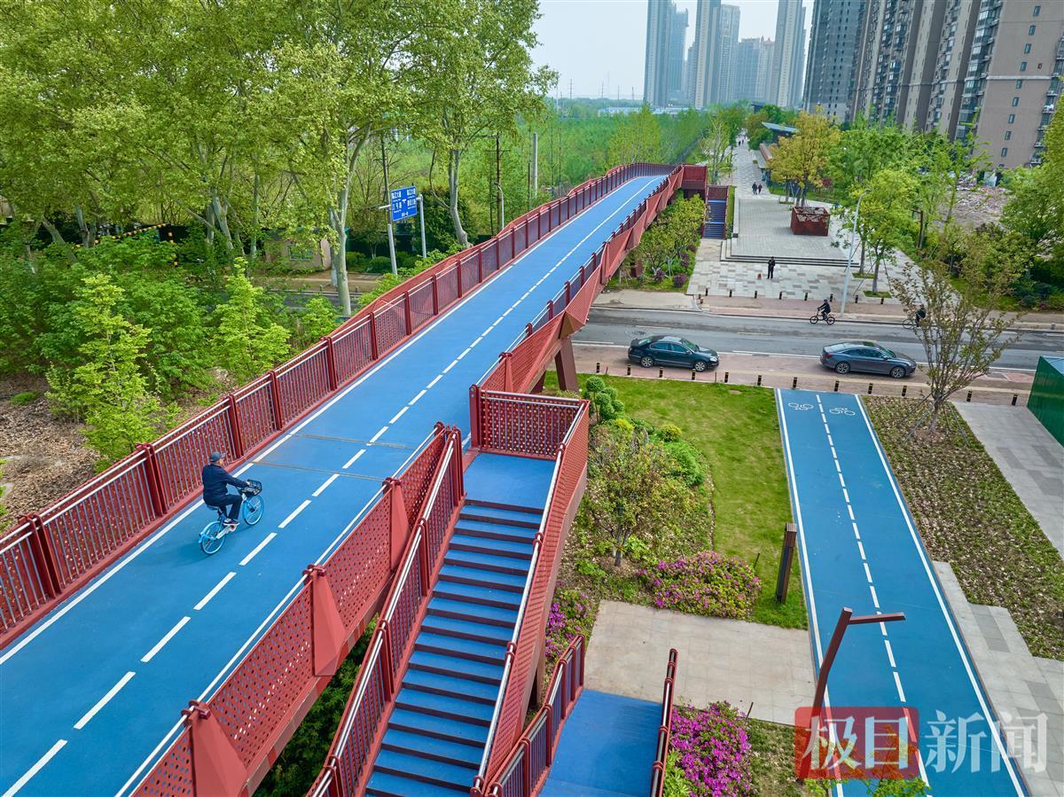 “在天桥上骑车,穿梭在城市高楼和树梢之间的感觉非常棒!”4月8日上午,正在武汉武昌生态文化长廊建设一路段骑行的李先生告诉记者。