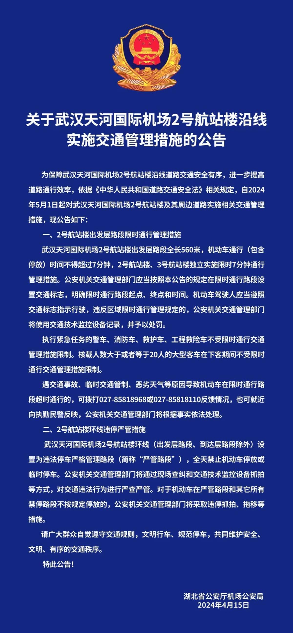 4月15日,湖北省公安厅机场公安局发布《关于武汉天河国际机场2号航站楼沿线实施交通管理措施的公告》,2号航站楼出发层路段机动车通行(包含停放)时间不得超过7分钟,2号航站楼环线全天禁止机动车停放或临时停车。