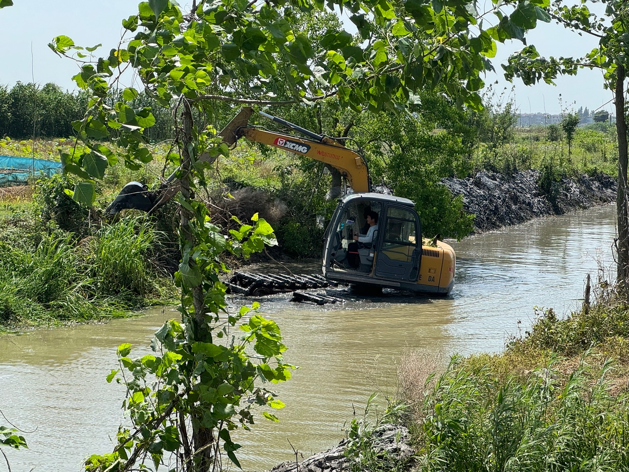 5月14日,荆州监利市网市镇,一台挖掘机正在挖掘畜禽养殖专业合作社旁排灌渠内的底泥。此前,督察人员在抽查时发现养殖场存在粪污外排现象。