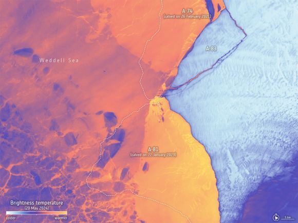 IT之家 5 月 26 日消息,据美国国家冰雪数据中心的消息,2024 年 5 月 20 日,南极洲布伦特冰架崩裂出一座面积约为 380 平方公里的巨型冰山。IT之家注意到,这是该地区四年内的第三起重大冰山崩解事件,此前分别在 2021 年和 2023 年发生了代号为 A-74 和 A-81 的冰山脱离冰架事件。