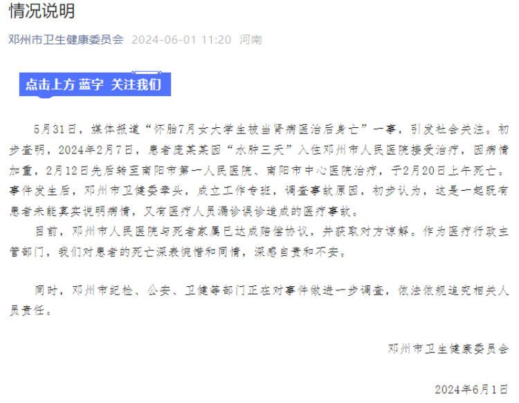 邓州市卫生健康委员会消息,5月31日,媒体报道“怀胎7月女大学生被当肾病医治后身亡”一事,引发社会关注。初步查明,2024年2月7日,患者庞某某因“水肿三天”入住邓州市人民医院接受治疗,因病情加重,2月12日先后转至南阳市第一人民医院、南阳市中心医院治疗,于2月20日上午死亡。事件发生后,邓州市卫健委牵头,成立工作专班,调查事故原因,初步认为,这是一起既有患者未能真实说明病情,又有医疗人员漏诊误诊造成的医疗事故。
