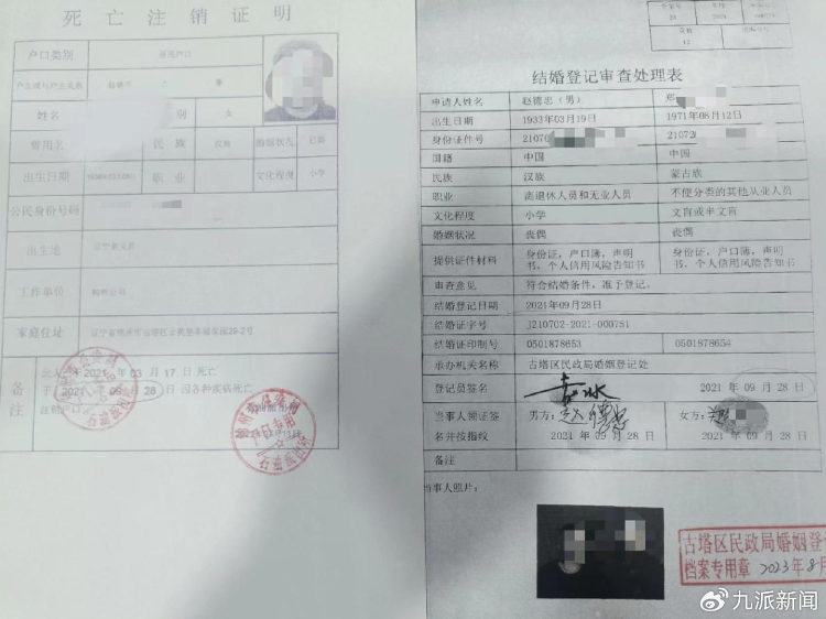 九派新闻此前报道,2022年6月,65岁的赵永秋得知锦州家中的养父已离世两天,从沈阳赶回家后发现,90岁的养父在死前9个月,与年龄相差38岁的保姆领证结婚,房产已过户到保姆儿子名下,过世后的丧葬补助费、抚恤金等3.9万余元亦被保姆儿子领走。
