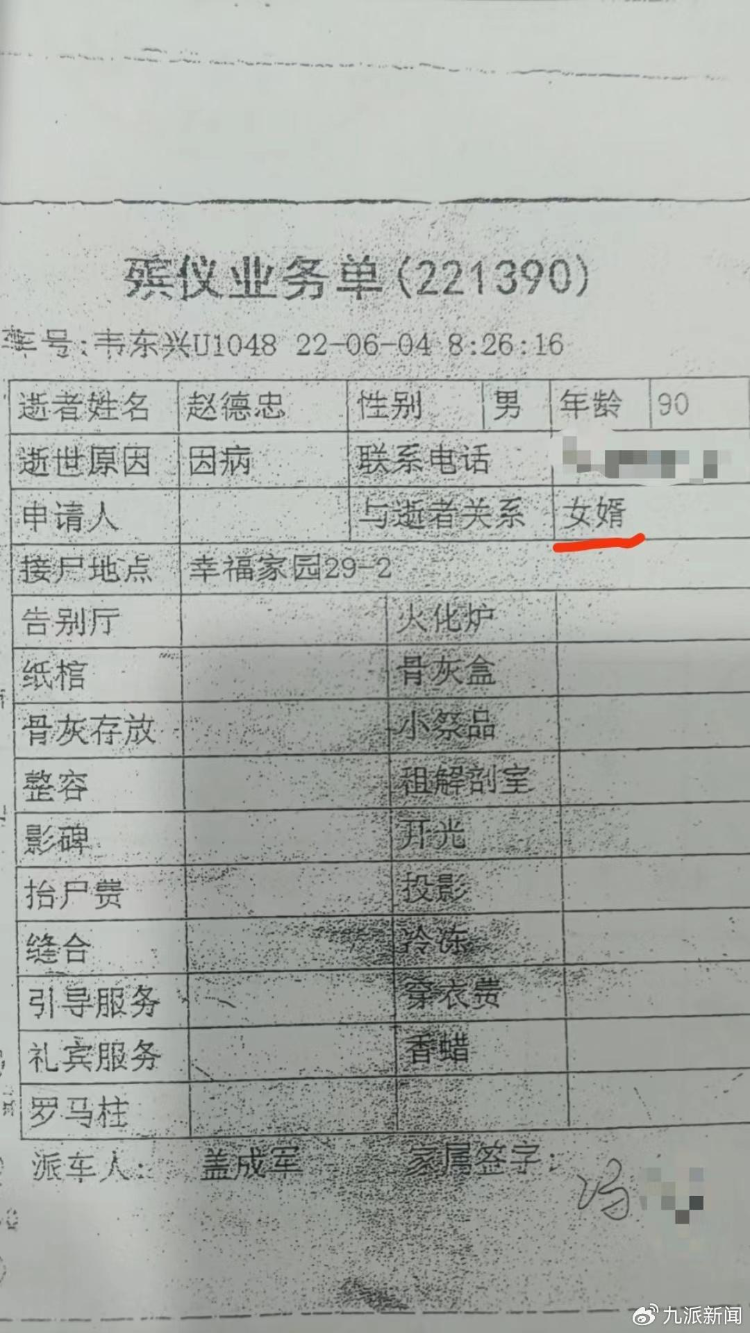 老人的殡仪业务单为保姆儿子签字,关系填写为女婿。图/受访者提供。
