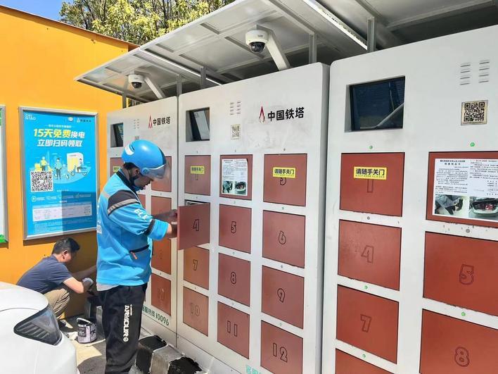 6月10日,临近中午,在位于武昌区中南二路铁塔能源骑手之家前的换电柜处,外卖小哥戴金良正骑着电瓶车前来换电。只见他拿出手机对着柜门上的二维码轻轻一扫,柜门弹开,放入少电电池。几秒钟后,一个装有满电电池的柜门打开,取出电池,关闭柜门,再把电池装上电瓶车,一番操作下来不到一分钟的时间。