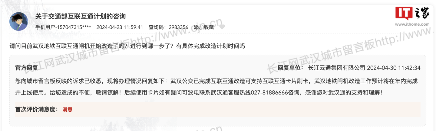 参考IT之家先前报道,今年 4 月 23 日有用户在武汉城市留言板咨询“长江云通集团有限公司”关于“武汉地铁互联互通闸机改造消息”,而“长江云通集团有限公司”回应称“武汉地铁闸机改造工作预计将在年内完成并上线使用”。