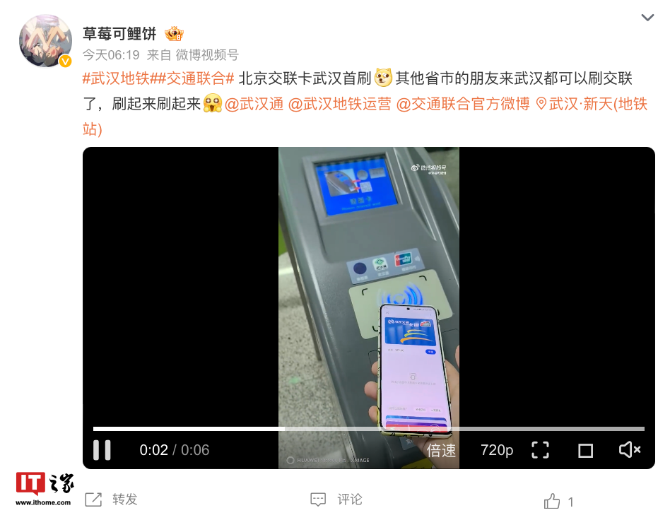 据IT之家小伙伴投稿综合博主博文,目前武汉地铁正陆续启用交通联合卡支持,有交通博主在微博声称目前武汉地铁 19 号线已支持刷全国交通联合卡,其他线路预计也将在近期上线相关支持。