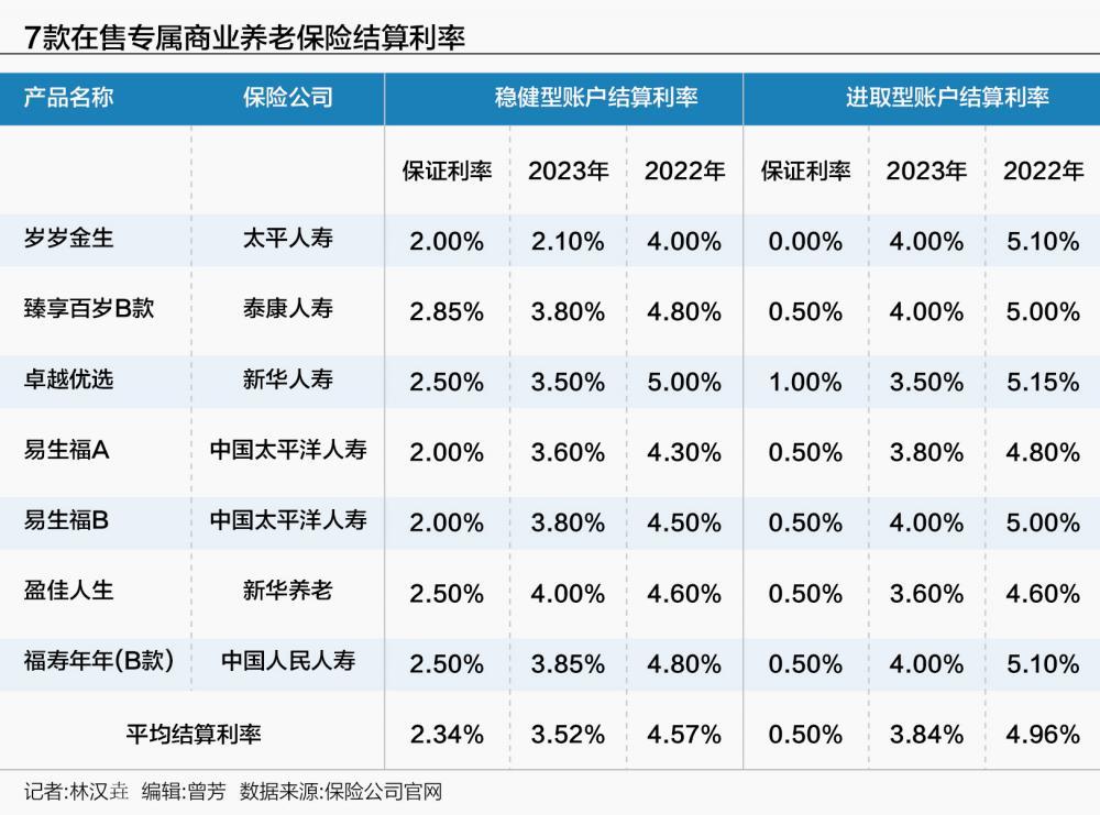 记者发现,在公布近期结算利率的7款在售专属商业养老保险中,无论稳健型账户还是进取型账户,2023年的整体结算利率与2022年相比都有所下降。