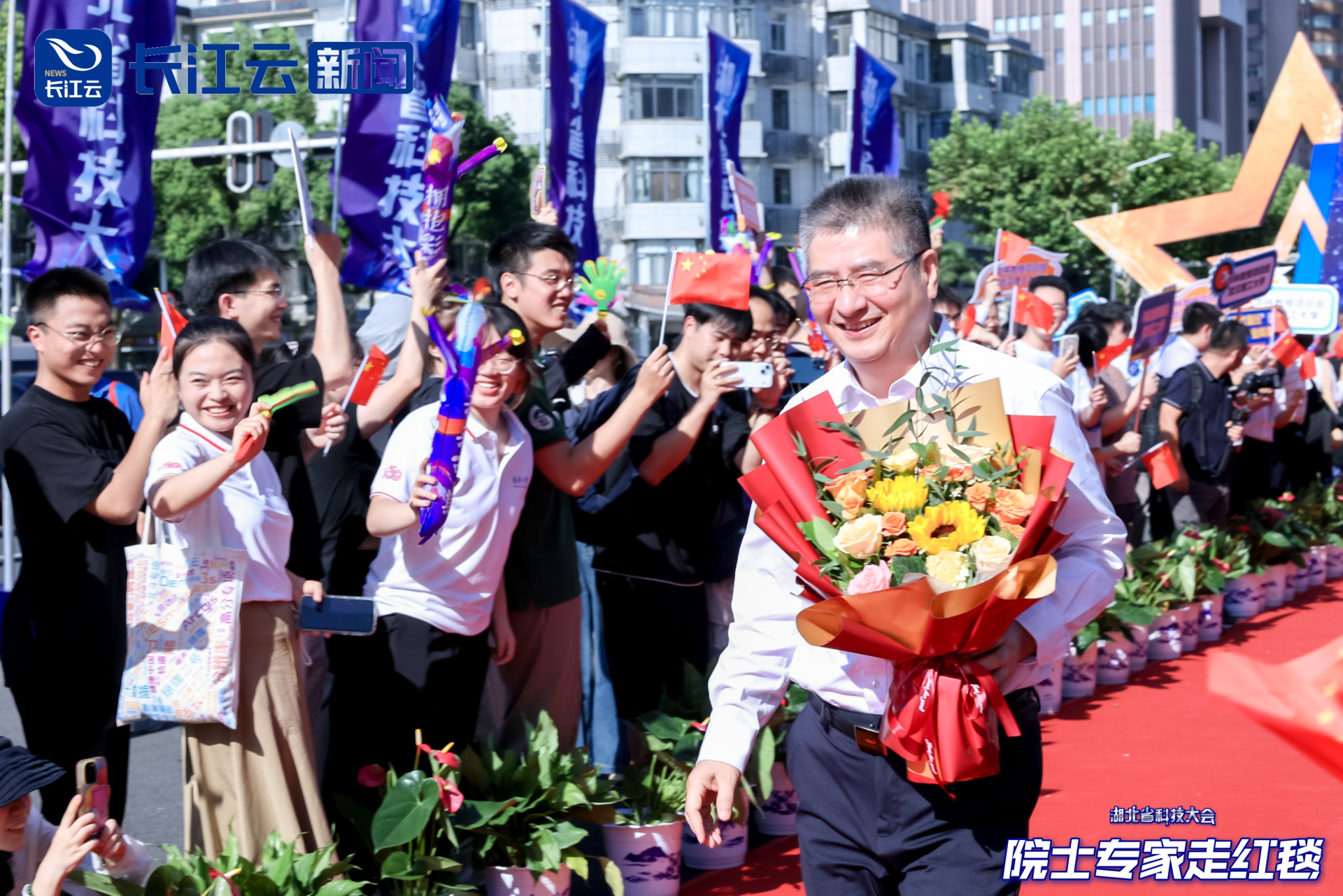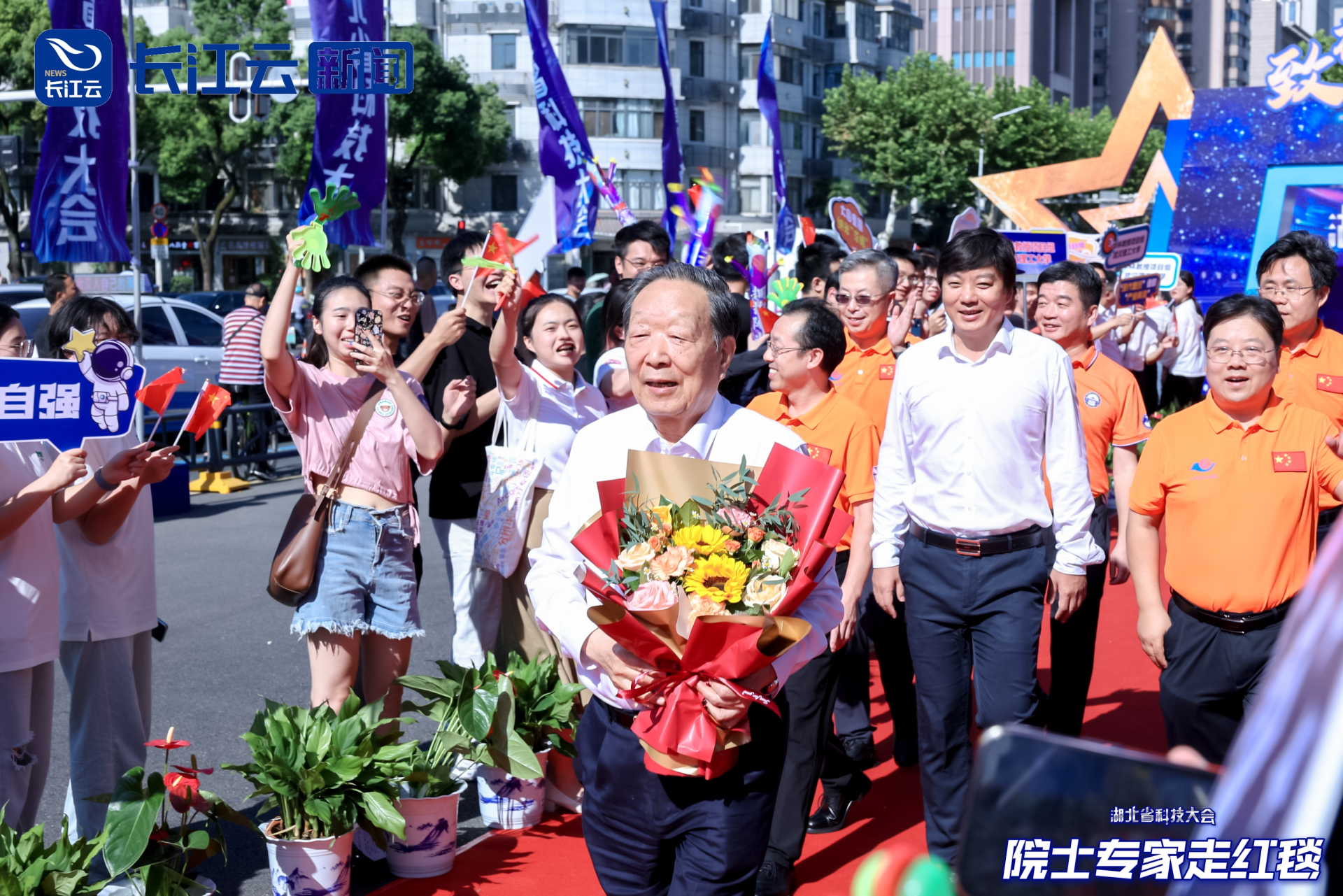 会前,在洪山礼堂外,院士专家走红毯活动是每年科技大会最为激动人心的时刻,活动现场,上百米长的红毯从洪山路的一侧一直延伸到礼堂内。红毯两侧,鲜花簇拥。今年的红毯上依旧“群星璀璨”, 位闪耀的“科学之星”从红毯上款步走过,他们中有两院院士,有科技企业负责人,还有80后的青年科学家。他们的到来,吸引了两侧“粉丝团”雷鸣般的掌声。