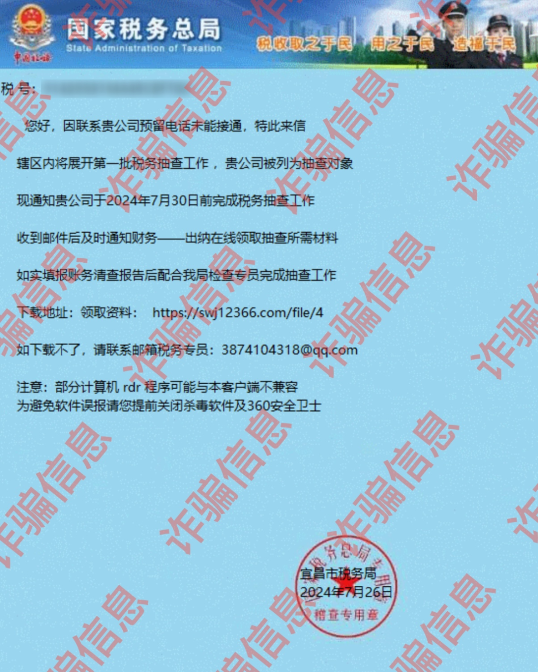 近期,我省部分地区发现存在伪造税务局官方口径,以税务抽查工作名义向纳税人发送诈骗彩信、微信、钓鱼邮件的行为,攻击者通过彩信、微信、邮件诱导纳税人通过钓鱼网站下载安装程序(远控木马)。请广大纳税人提高警惕,不要随意点击来源不明的链接,不要随意下载运行陌生软件,防止自身利益受到损害。