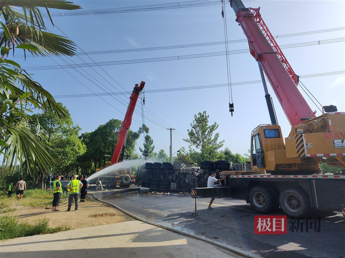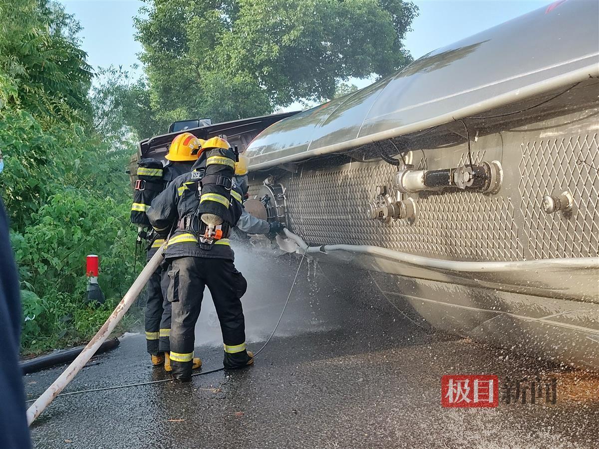 当天,武汉市消防救援指挥中心接到报警后,迅速调派永安大道站出动4辆消防车、20名消防员赶赴现场。消防员到达现场后,发现一辆十多米长的槽罐车整体侧翻在道路一旁,罐体一侧不断有液体渗出,空气中弥漫着刺鼻气味。消防员立刻对周边实施警戒,并设置水枪阵地对罐体泄露部位出水进行稀释。