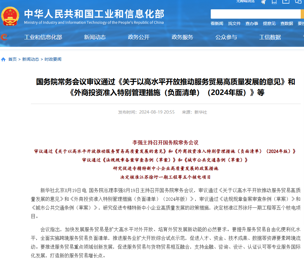 国务院常务会议审议通过了《关于以高水平开放推动服务贸易高质量发展的意见》和《外商投资准入特别管理措施(负面清单)(2024年版)》。会议还审议通过了《法规规章备案审查条例(草案)》和《城市公共交通条例(草案)》,并研究了促进专精特新中小企业高质量发展的政策措施。