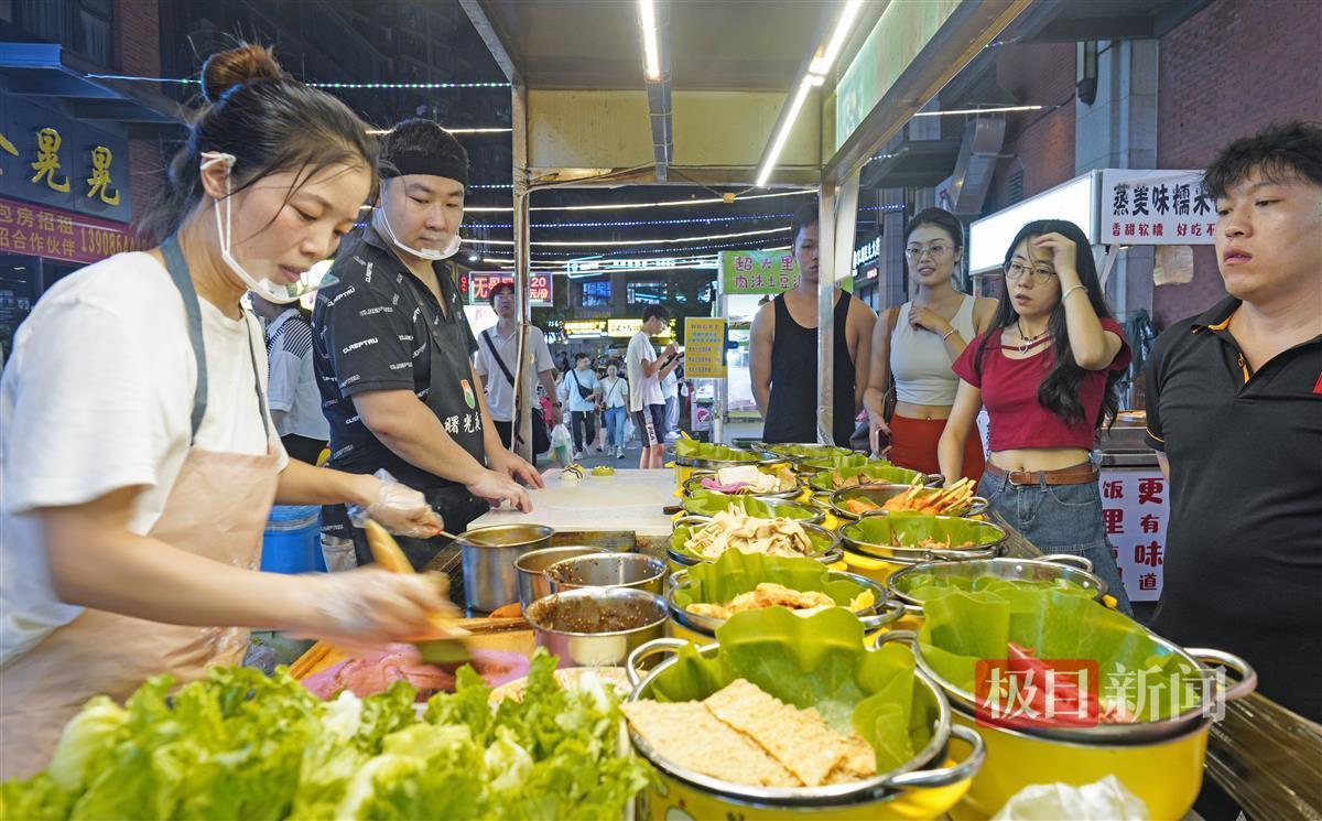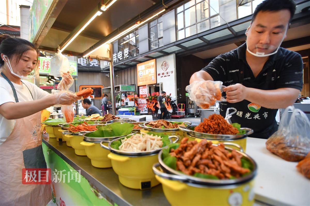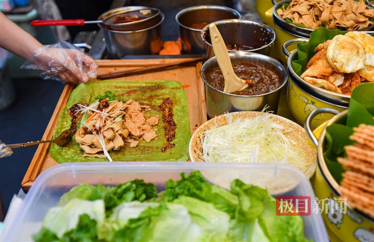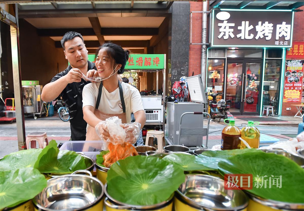 8月23日,武汉光谷曙光夜市。一个卡通面团啪地一声落在泛着油光的大理石板上,杜林峄双手握着擀面杖,将面团向四周延展,擀成一张手帕大小的面皮,随后放到铁板上烫熟,一旁的妻子葛小雅拿起面皮,放上千张丝、生菜、牛肉,卷起递到顾客手中。在不到四十秒的时间里,夫妻合作,一个卷饼做好。从2019年开始,小杜夫妇仅用了两年多的时间,就在武汉实现了买房购车梦。