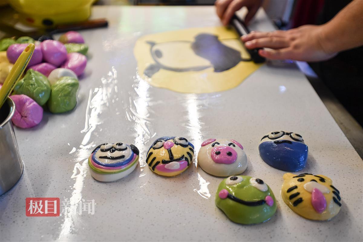 在“杜哥卷饼”摊前,从下午五点半开张,食客不断,特别是在七点多的高峰期,有时能排十多米的长队。小杜的推车上,有各种颜色的面团,这些颜色都是果蔬的天然色素,比如黄色是南瓜,绿色是菠菜,橙色是胡萝卜;各色的面团还有众多卡通形象,比如青蛙王子、熊猫、哈士奇等。