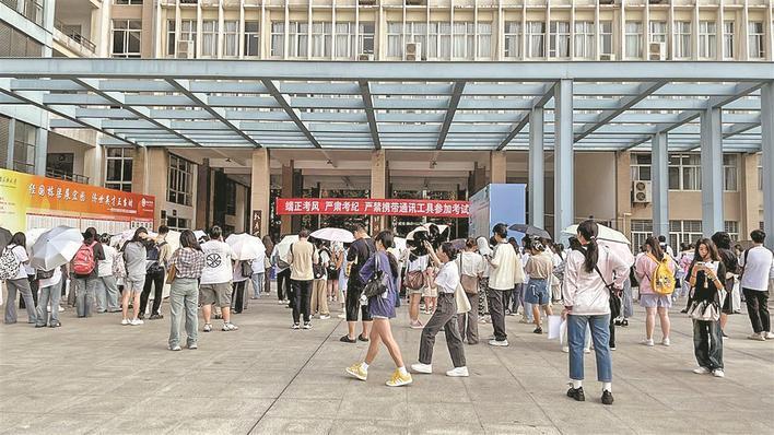 在湖北大学考点外,上午8时左右已有不少考生到达,大部分考生都在利用考前最后的时间,手捧复习资料背诵着知识点,也有三三两两的考生聚在一起讨论着问题。