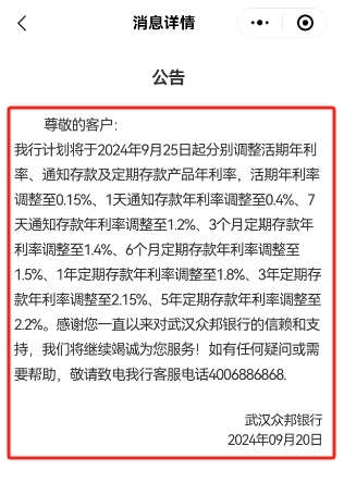 9月20日,众邦银行再发公告,将于2024年9月25日起对活期存款、通知存款及定期存款产品年利率进行下调。其中,活期年利率调整至0.15%、1天通知存款年利率调整至0.4%、7天通知存款年利率调整至1.2%、3个月定期存款年利率调整至1.4%、6个月定期存款年利率调整至1.5%、1年定期存款年利率调整至1.8%、3年定期存款年利率调整至2.15%、5年定期存款年利率调整至2.2%。