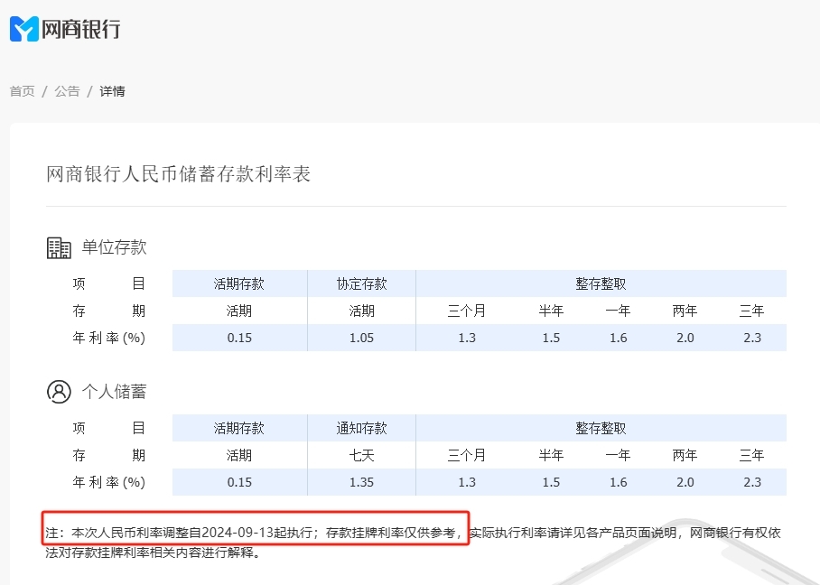 据网商银行官网公告显示,该行于2024年9月13日起执行新的人民币储蓄存款利率表。其中,三年期定期存款(整存整取)年利率已降至2.3%,两年期定期存款(整存整取)年利率已降至2.0%。