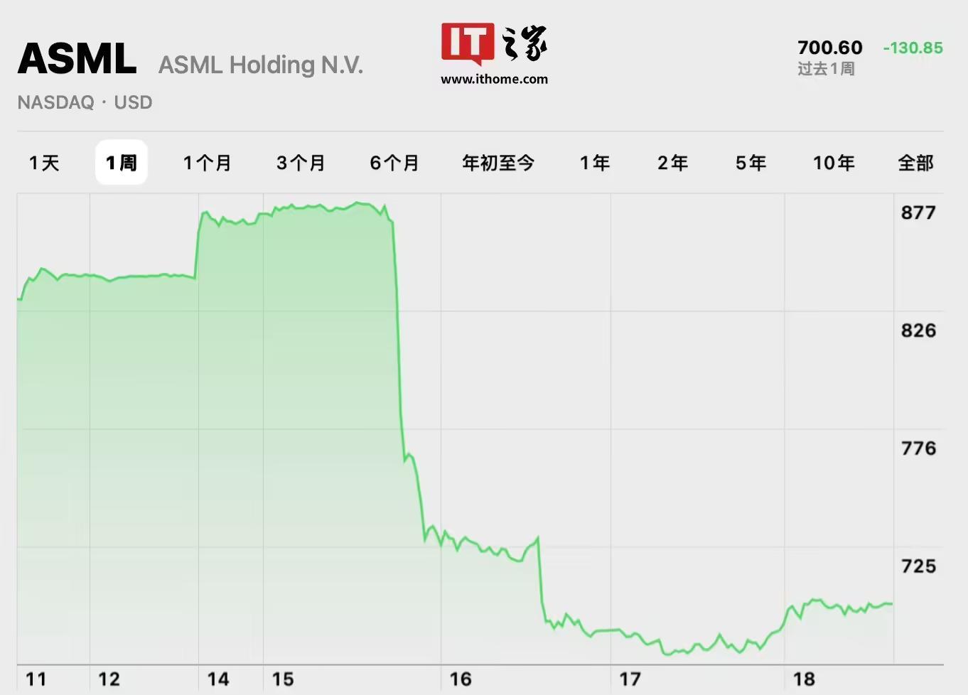 IT之家 10 月 18 日消息,荷兰光刻机巨头阿斯麦(ASML)因为提前泄露了财报数据,且显示业绩大幅下滑,导致股价暴跌,该公司在 10 月 15 日跌幅达 15.6%、16 日进一步下跌 5.1%,收盘报 633.9 欧元(当前约 4899 元人民币),目前阿斯麦市值已蒸发 600 多亿欧元,失去欧洲市值最高科技公司头衔,德国软件巨头思爱普市值暂居欧洲科技公司之首。