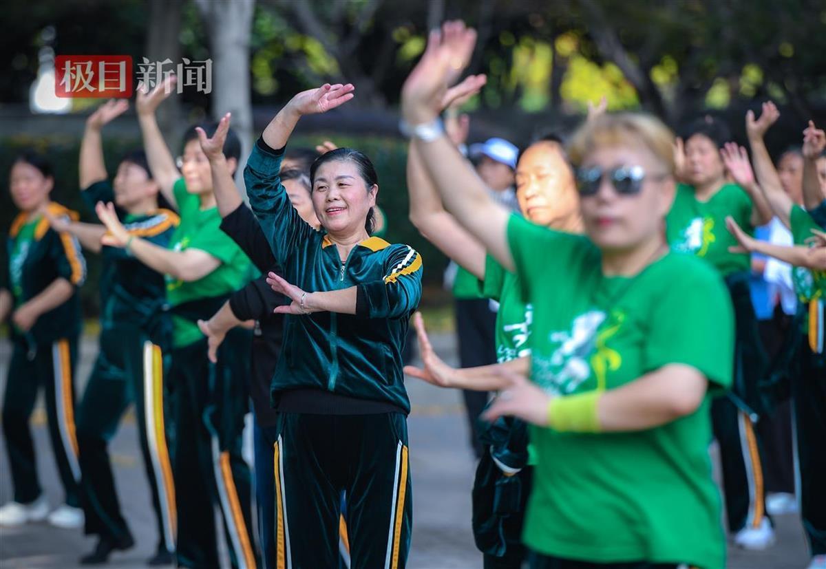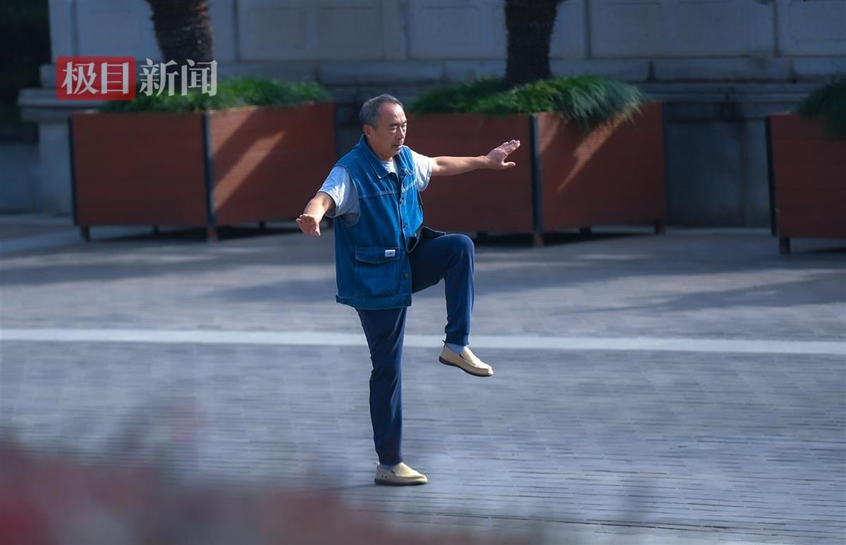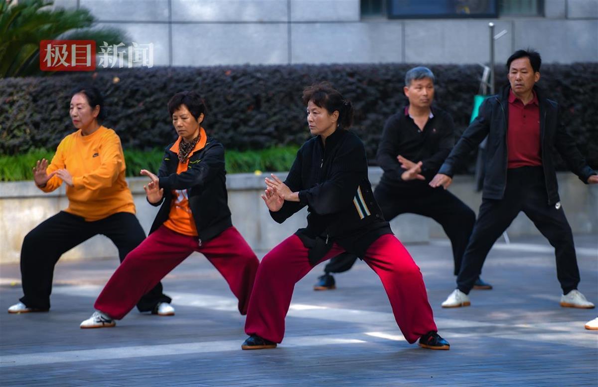 原标题:洪山广场市民晨练热情不减,立冬后暖意融融
