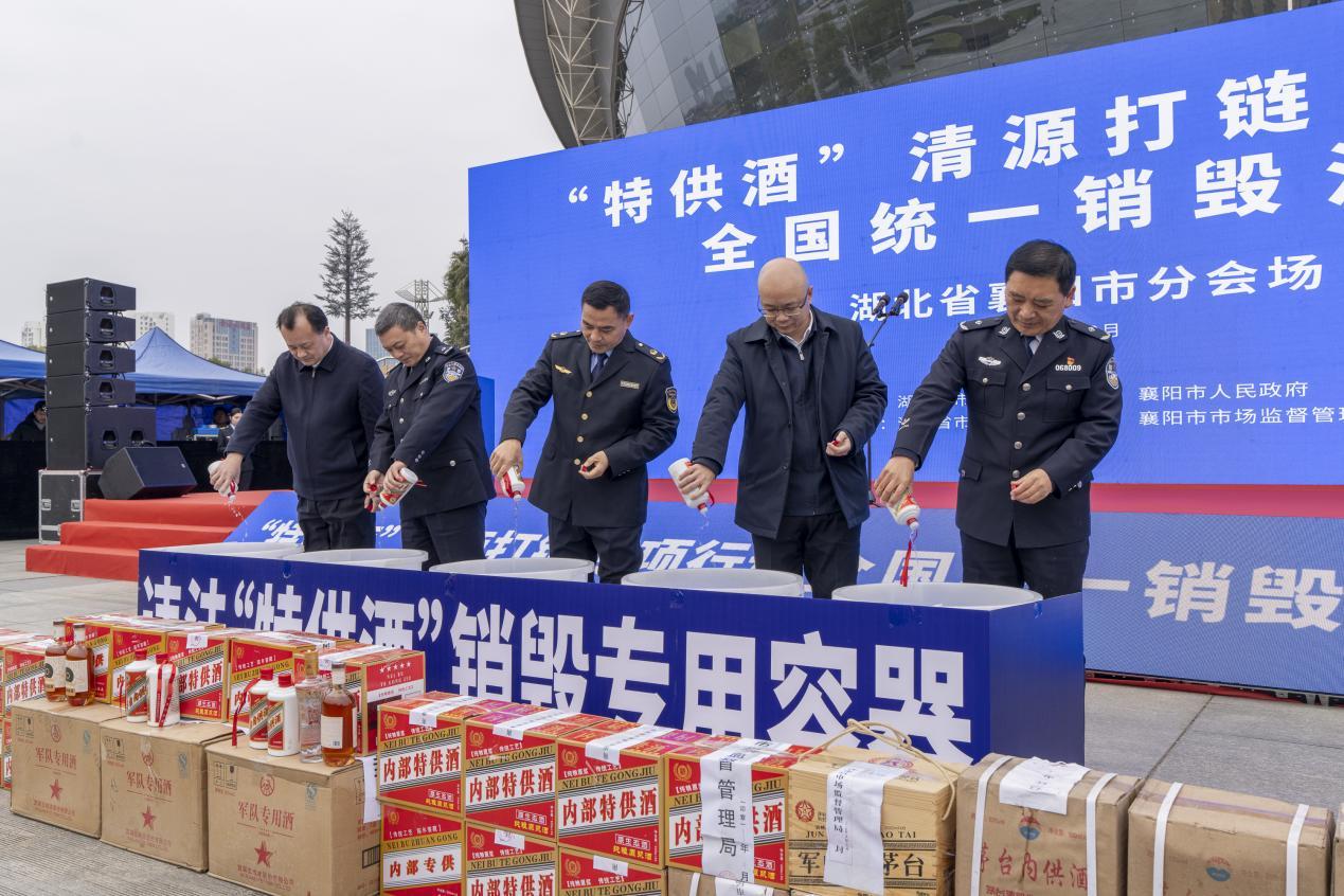 在“特供酒”统一销毁环节,湖北省市场监管局副局长邓仲林,湖北省公安厅治安总队食药侦支队副支队长喻晓,襄阳市人民政府副市长朱东斌,襄阳市市场监管局局长刘涛,襄阳市公安局副局长王绍洪对“特供酒”进行现场销毁。随后,2000余瓶“特供酒”通过货车统一运送至销毁公司集中销毁。