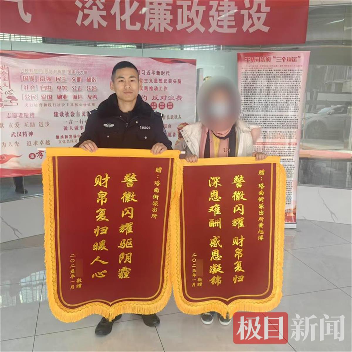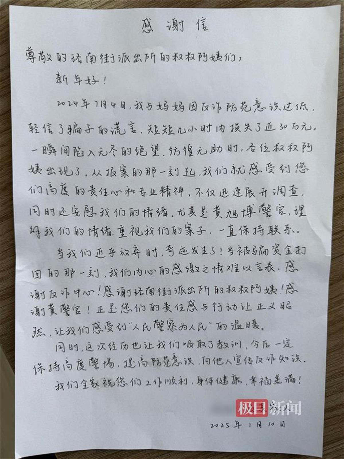 收到警方追回的被骗资金后,陆女士和女儿小周心中满是感动。2025年1月10日,警察节当天,陆女士委托女儿小周将两幅锦旗和一封手写感谢信送到派出所。感谢信中写到:“感谢珞南街派出所的叔叔阿姨!感谢黄警官!正是您们的责任感与行动让正义昭然,让我们感受到‘人民警察为人民’的温暖。”