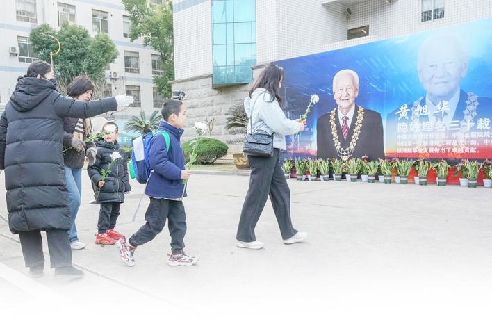 2月8日一大早,来自武汉市中山路小学的百余名师生代表来到吊唁现场,向黄旭华献花。