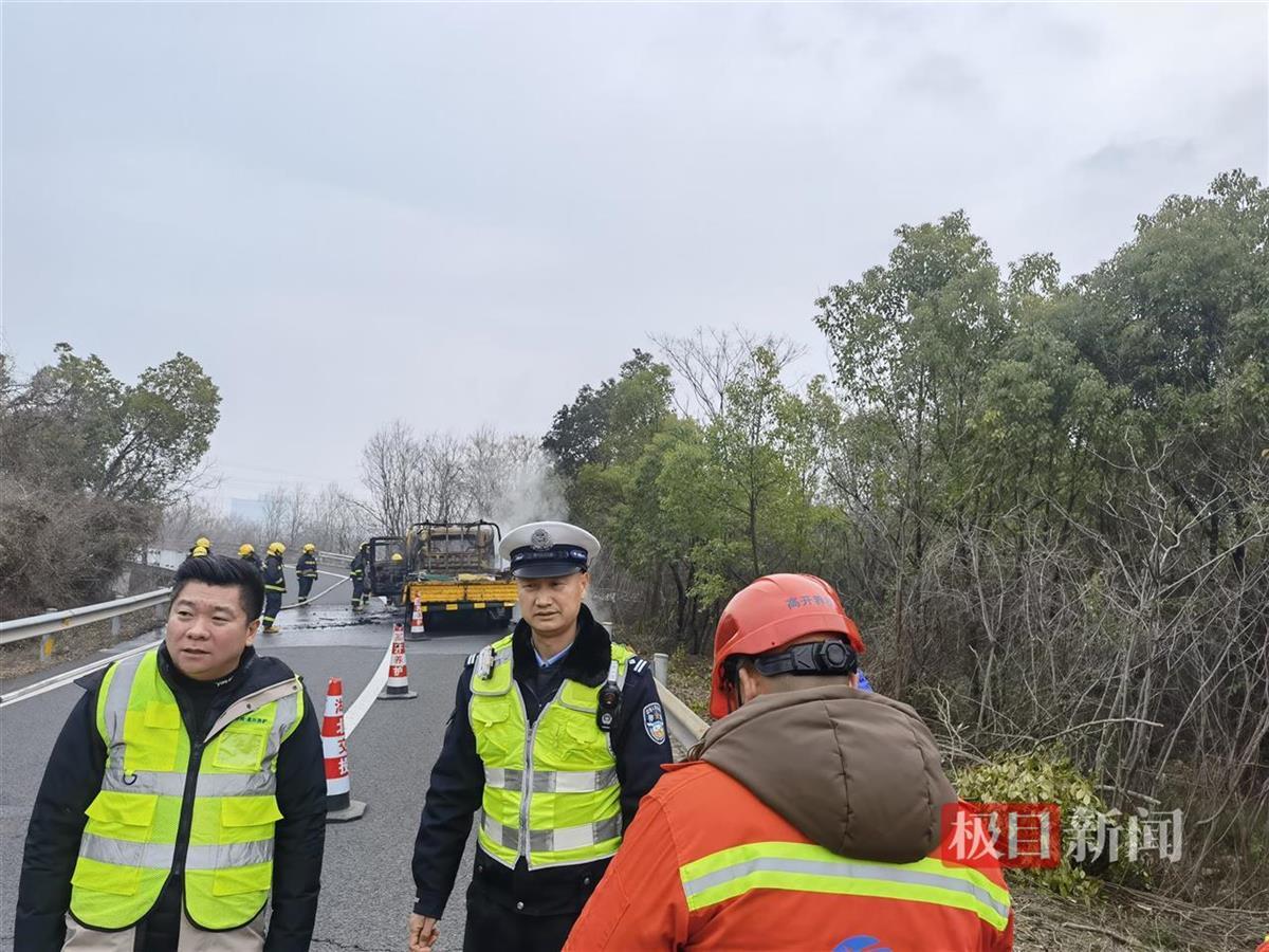 指挥中心接警员指导司机打开双闪灯、设置反光标志筒,要求所有人员转移至护栏外,随即紧急联系路面民警和当地消防部门。