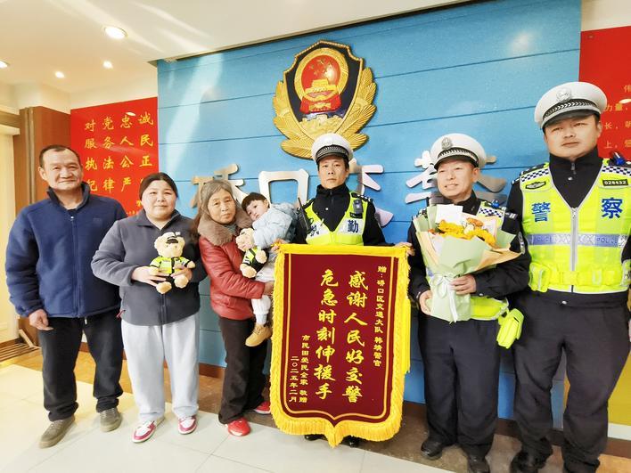 楚天都市报极目新闻讯(记者叶文波 通讯员杜泽文 实习生刘晓玥)“叔叔,谢谢你!”2月24日上午,武汉市民黄女士带着公公、婆婆以及获救的小孩来到硚口区交通大队,向救命恩人、辅警韩靖表示感谢。小宝贝已经康复恢复了活力,他亲吻着韩靖的脸颊,萌化了在场人的心。