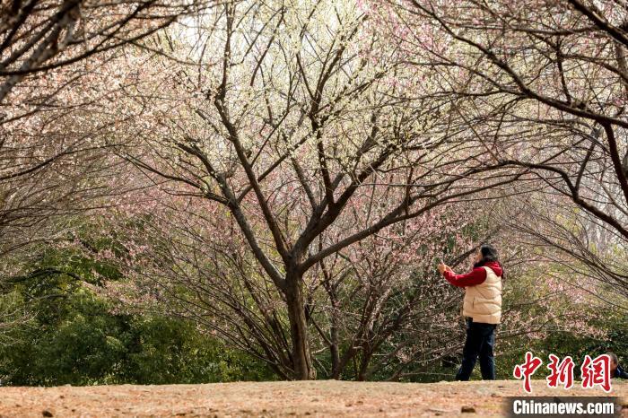 2月24日,武汉竹叶海公园梅花盛开,吸引众多市民前来踏春赏景,开启烂漫春日序章。图为市民拍摄盛开的梅花。中新社记者 张畅 摄