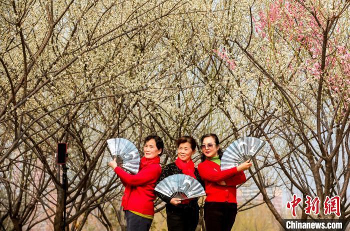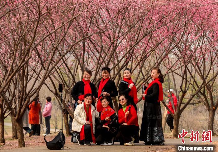 图为市民在盛开梅花中合影。中新社记者 张畅 摄