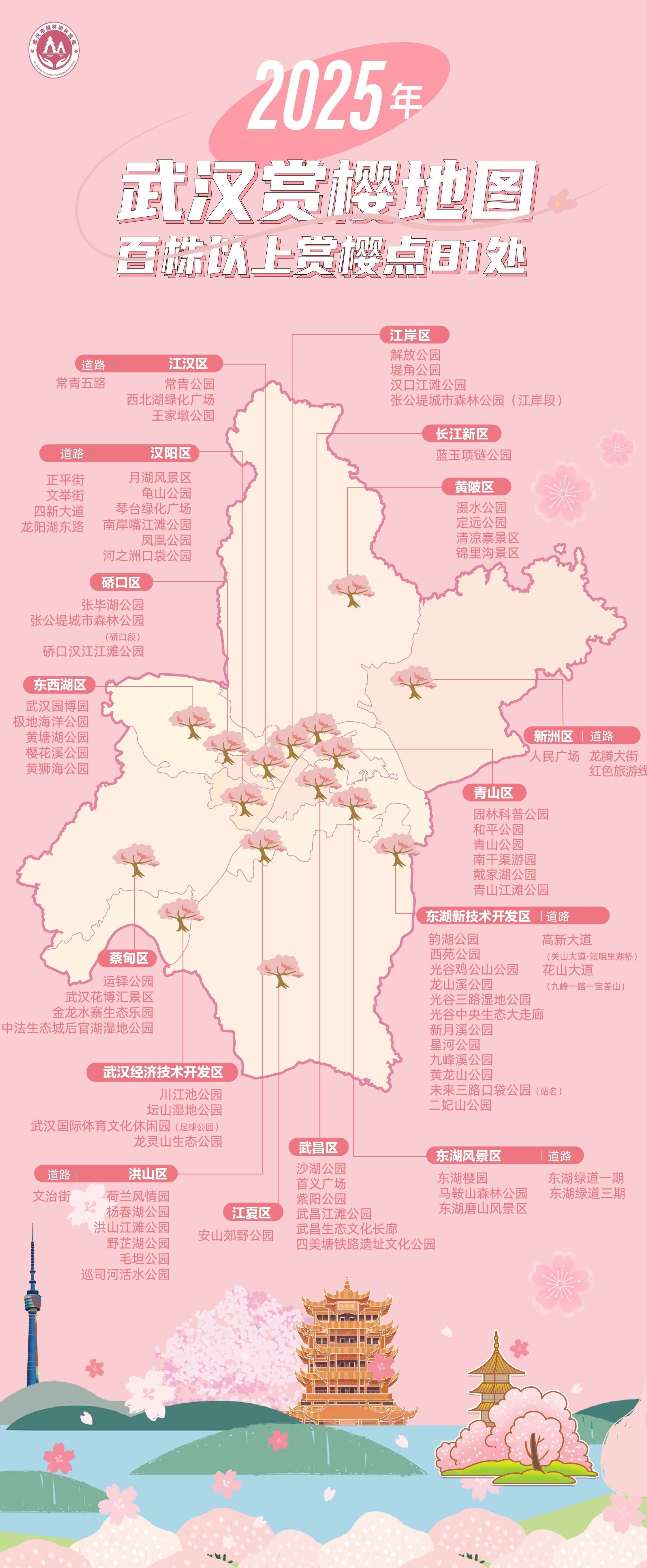 随着早樱绽放,武汉开启浪漫樱花季。3月1日,市园林和林业局发布2025年最新赏樱地图。据不完全统计,全市公园景区和道路共有赏樱点221处,其中种有百株以上樱花的樱花林有81处。