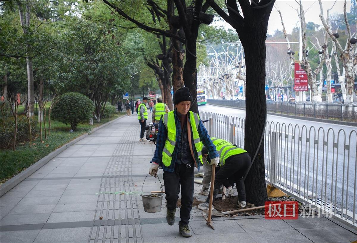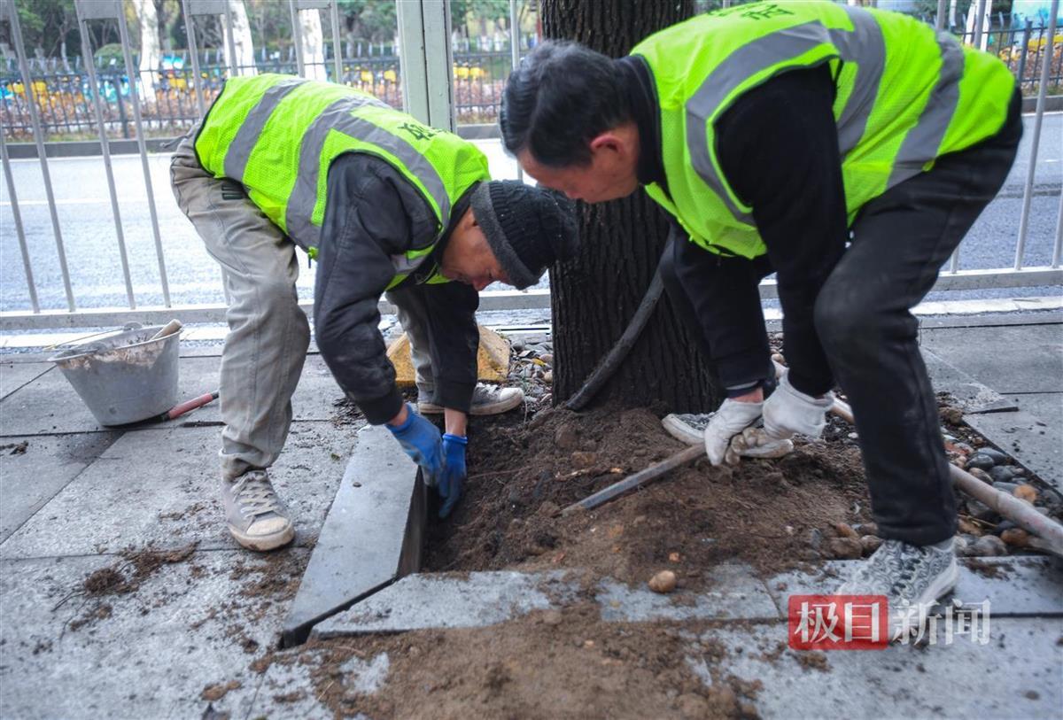 据现场工作人员介绍,从黄鹤楼下的人行道一直延伸至水果湖,不少行道树都出现了树根凸起的问题。武昌市政已经制定了详细的修整计划,并将对受损的行道树逐一进行修整和校正。