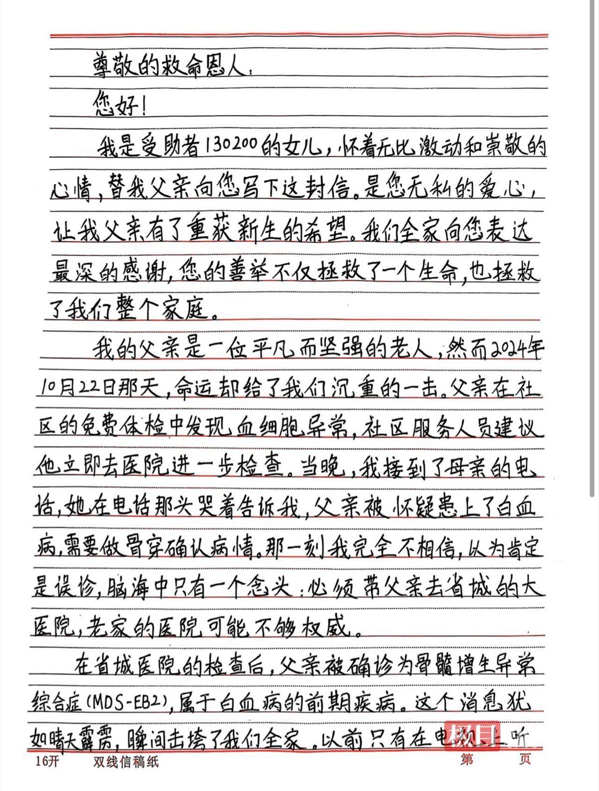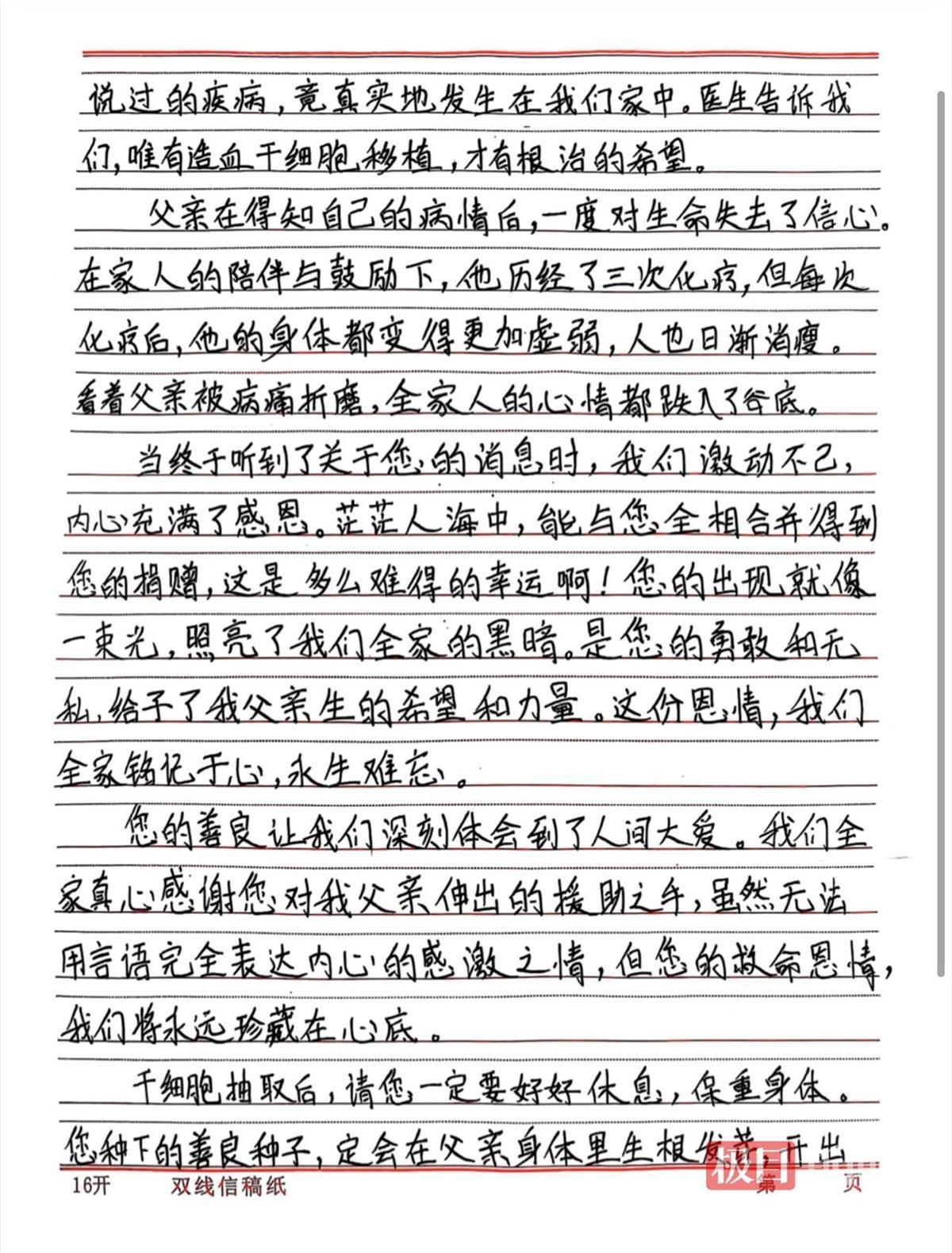 当天采集结束后,他收到了受捐者的女儿托工作人员送来的感谢信,信中深情写道:“是您无私的爱心,让我父亲有了重获新生的希望。我们全家向您表达最深的感谢,您的善举不仅拯救了一个生命,也拯救了我们整个家庭……您种下的善良种子,定会在父亲身体里生根发芽,开出希望之花,结出生命的果实。”