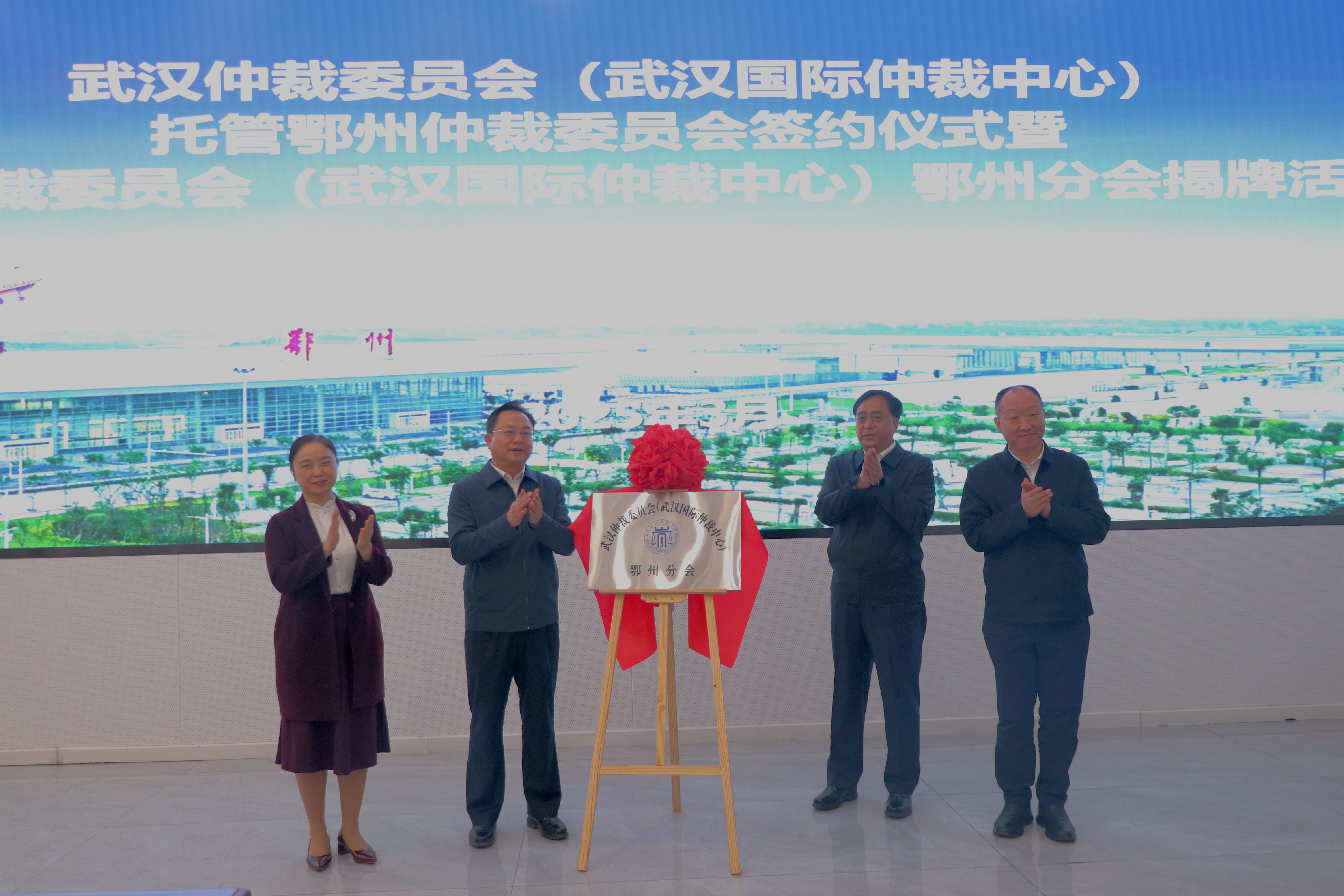 签约仪式结束后,杨军、孙兵、董煜华、陈旗共同为“武汉仲裁委员会(武汉国际仲裁中心)鄂州分会”揭牌,武鄂商事仲裁一体化正式启动。
