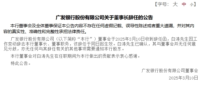 3月11日,广发银行官方发布公告,该行董事会于2025年3月10日收到辞任函,白涛先生因工作变动辞去本行董事长、董事职务,该辞任于同日起生效。