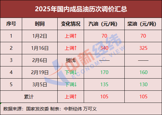 中新经纬注意到,今年以来,国内油价已经历五轮调价窗口,分别为“两涨两跌一搁浅”。调价后,国内汽、柴油价格每吨较去年底均上涨105元。若本轮调整落地,2025年调价格局将变为“两涨三跌一搁浅”。