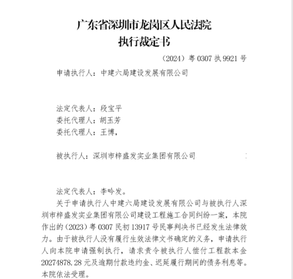 据龙岗区人民法院发布的(2024)粤0307执9921号执行裁定书显示,由于梓盛发实业未能履行生效法律文书确定的义务,中建六局向法院申请强制执行,请求责令梓盛发实业偿付工程款本金及逾期付款违约金等费用。法院依法受理并冻结了梓盛发实业持有的光明沪农商村镇银行1600万股股权,最终裁定拍卖该股权以清偿债务。公开资料显示,梓盛发实业为深圳光明沪农商村镇银行第四大股东,目前已成失信被执行人并被限制高消费。