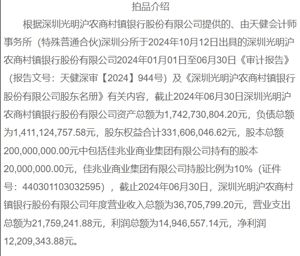此外,根据深圳光明沪农商村镇银行股份有限公司提供的、由天健会计师事务所(特殊普通合伙)深圳分所于2024年10月12日出具的深圳光明沪农商村镇银行股份有限公司2024年01月01日至06月30日《审计报告》(报告文号:天健深审【2024】944号)及《深圳光明沪农商村镇银行股份有限公司股东名册》有关内容,截止2024年06月30日深圳光明沪农商村镇银行股份有限公司资产总额为17.43亿元,负债总额为14.11亿元,股东权益合计3.32亿元,股本总额2亿元中包括佳兆业商业集团有限公司持有的股本2000万元,佳兆业商业集团有限公司持股比例为10%,截止2024年06月30日,深圳光明沪农商村镇银行股份有限公司年度营业收入总额为0.37亿元,营业支出总额为0.22亿元,利润总额为0.15亿元,净利润0.12亿元。
