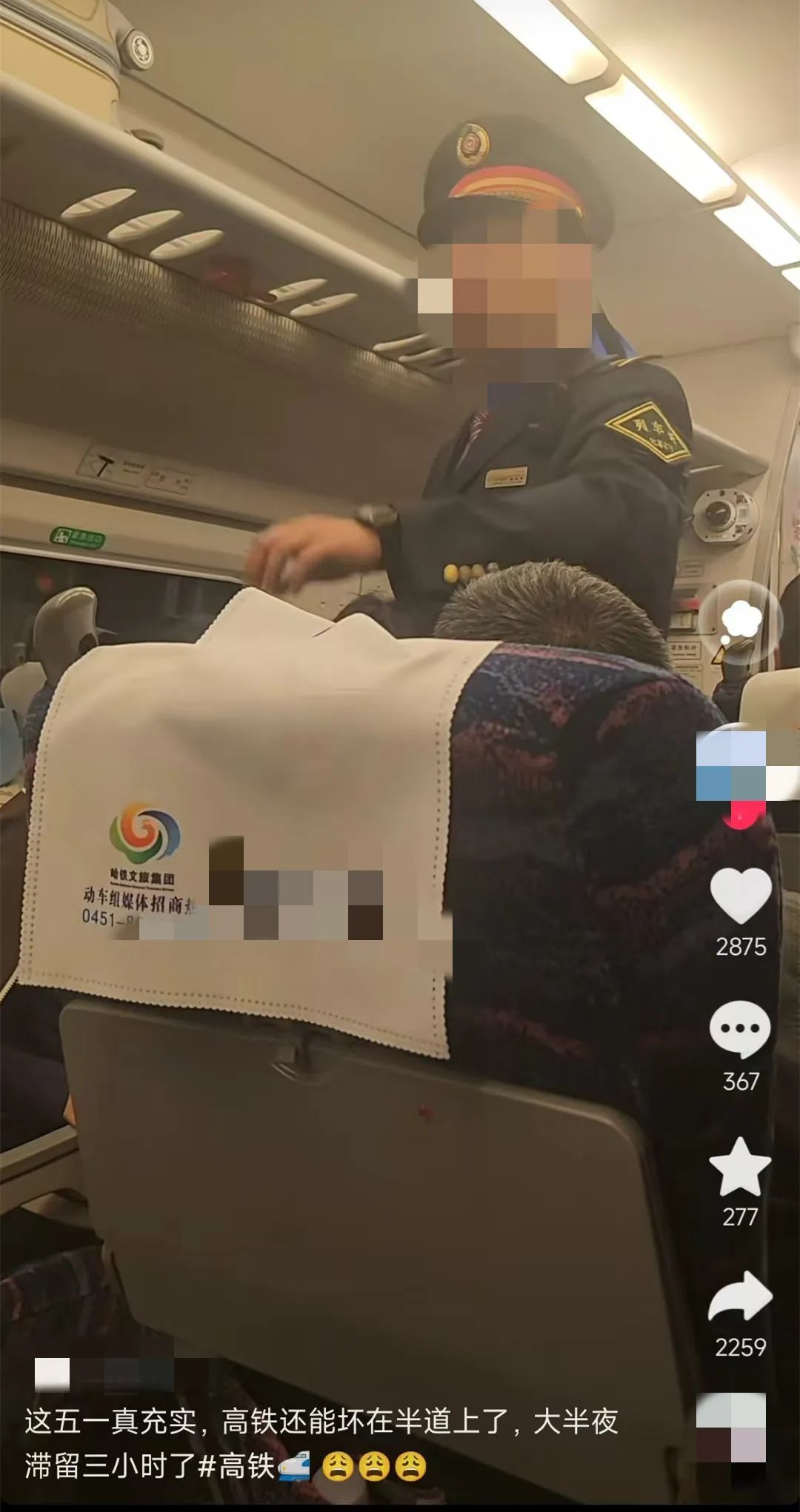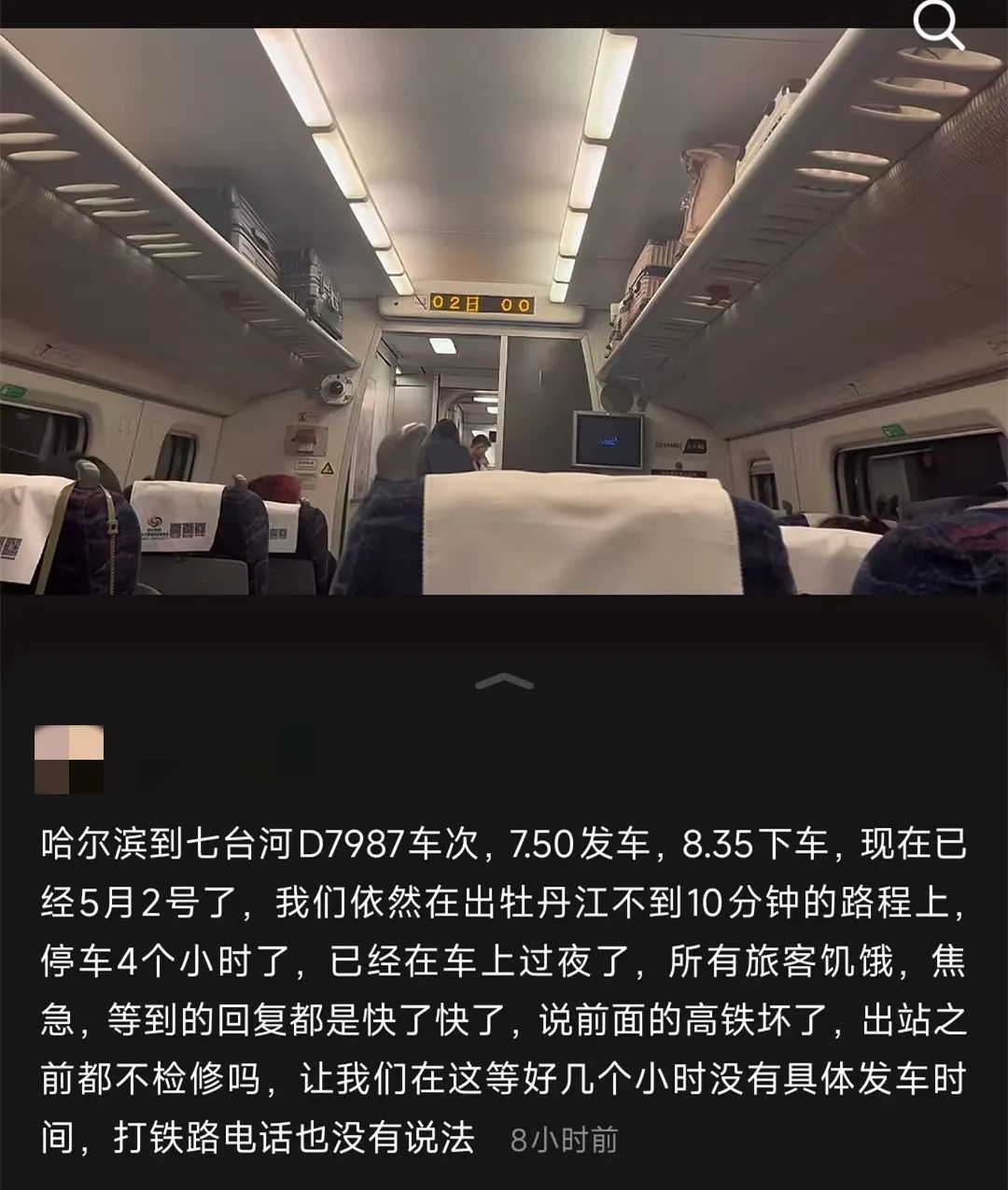 有东北网友发文称,他在5月1日晚乘坐D7987次列车(始发站哈尔滨,终点站七台河西)出行,19时50分左右上车,按计划应该是20时30分左右到站。然而,列车在出牡丹江站不到10分钟的时间,突然停车。且停车已经超过4个小时,网友称其发文时已经到5月2日凌晨,动车依然没有开动。该网友称,列车员告知旅客停车原因是前方有列车发生故障。