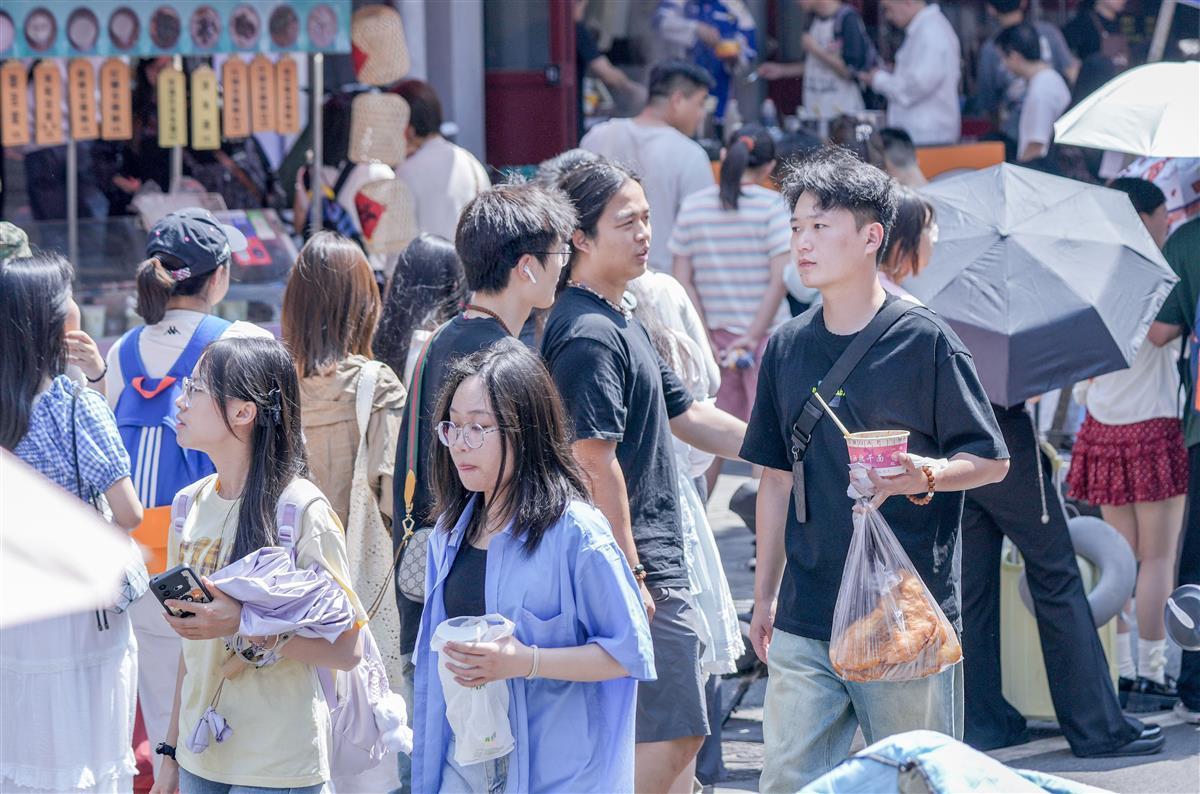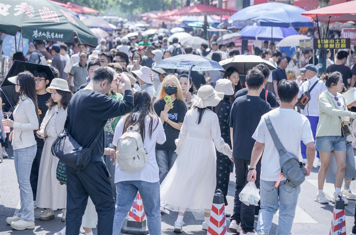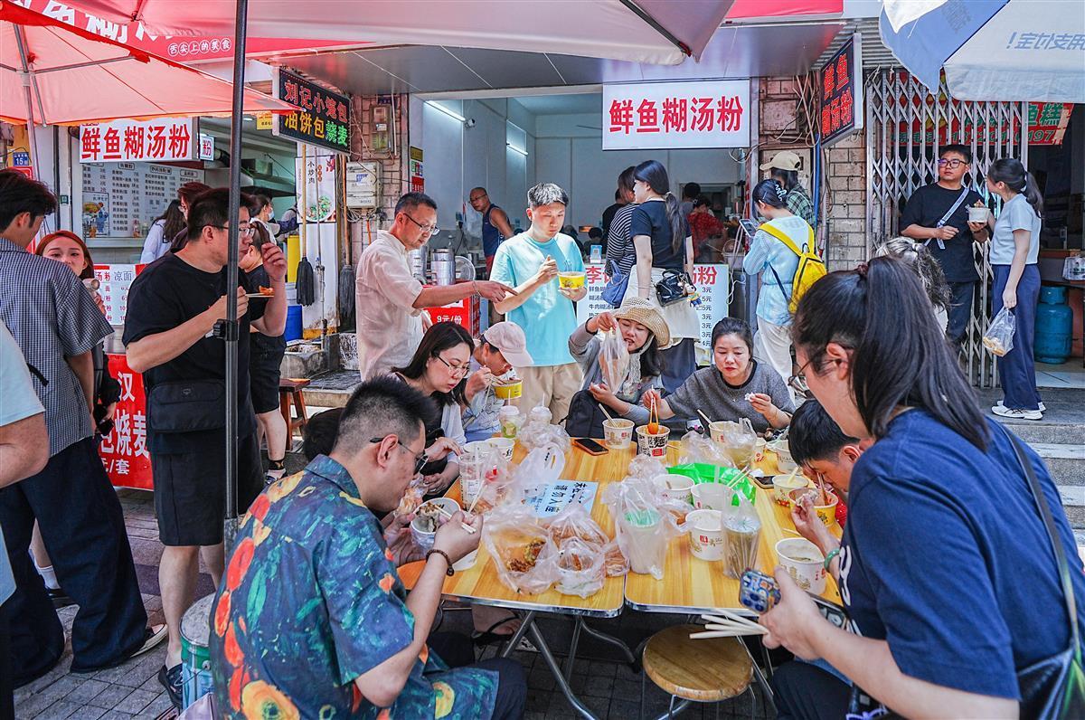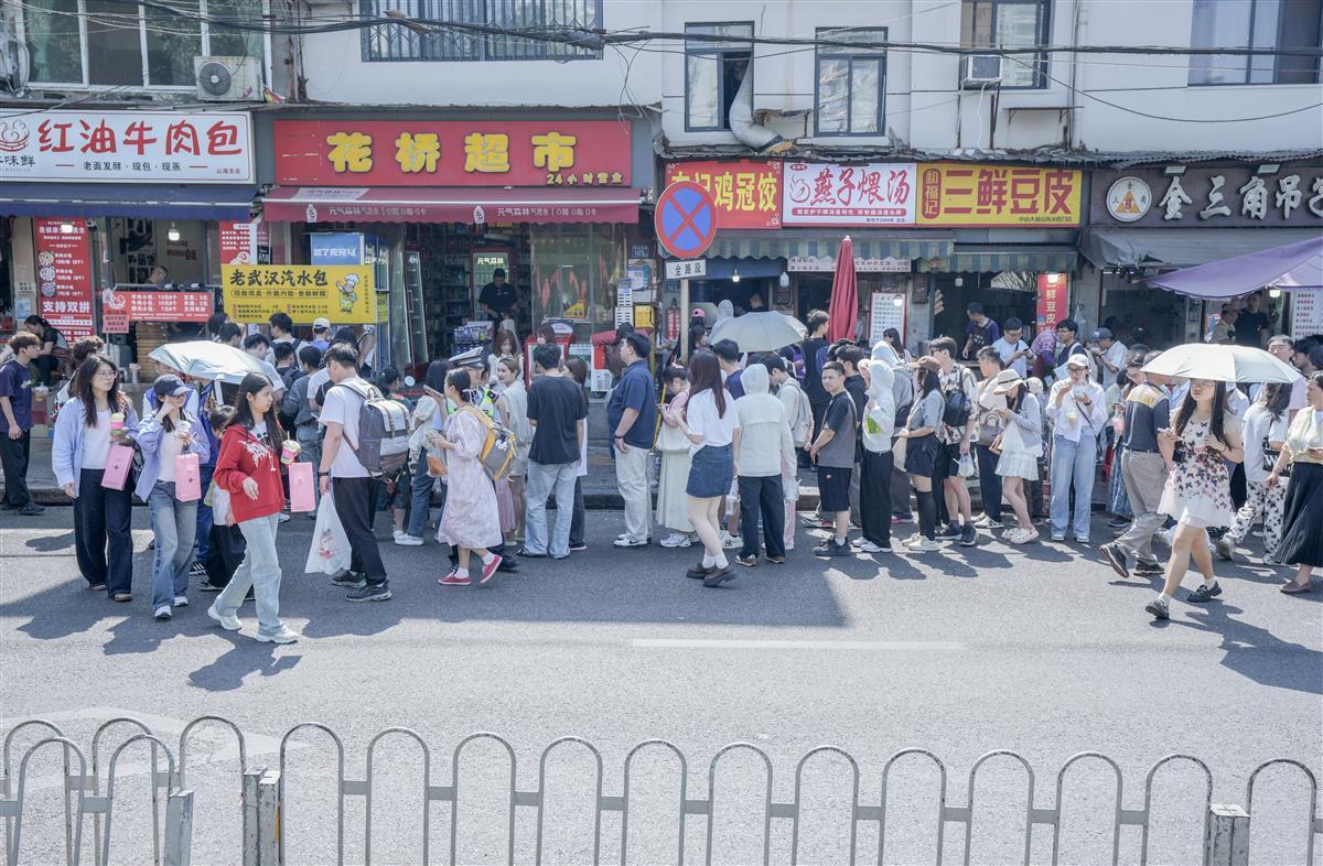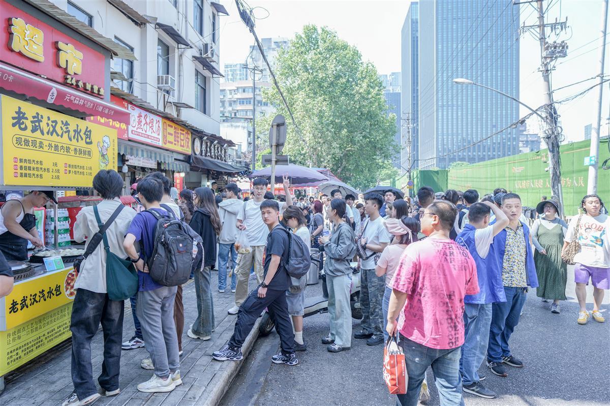 五一假期,位于武汉市江岸区的山海关路小吃街,每天被来自全国各地的游客挤爆。