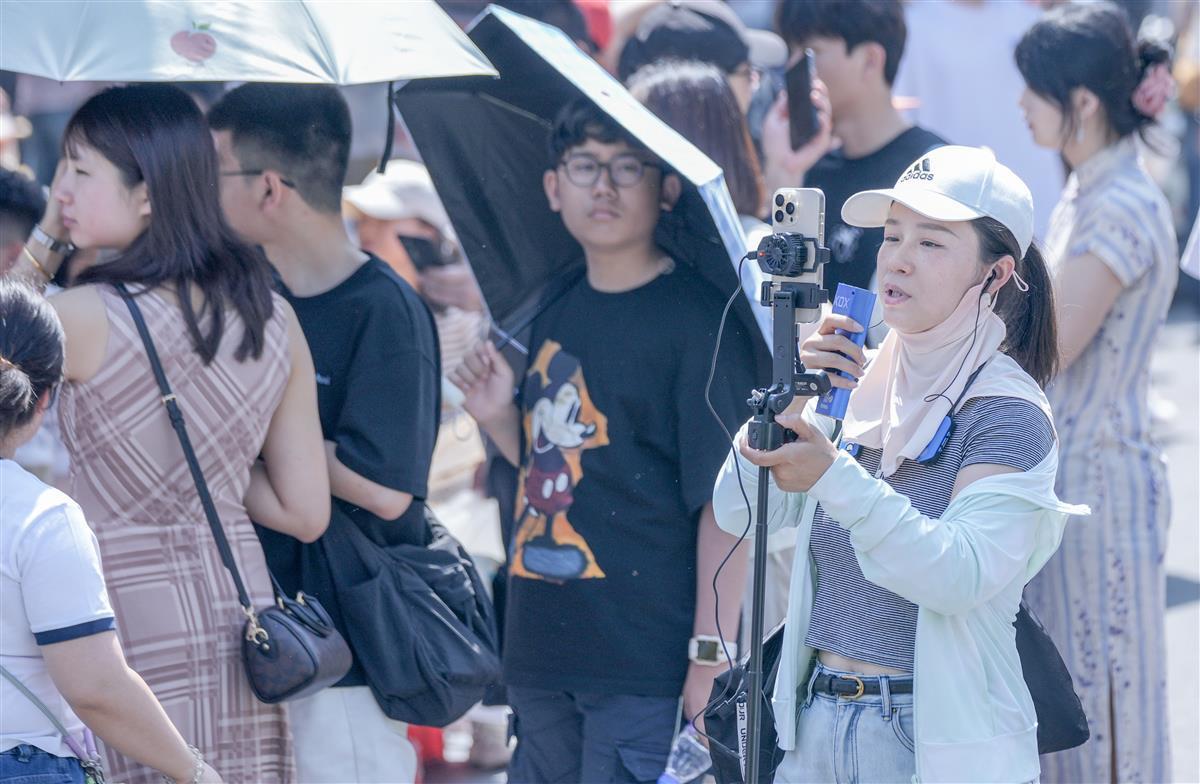 “拍个照纪念一下!”排了半个小时队买到一份豆皮后,来自新疆的美女小刘兴奋地举起打包好的豆皮在店门前拍起照来。