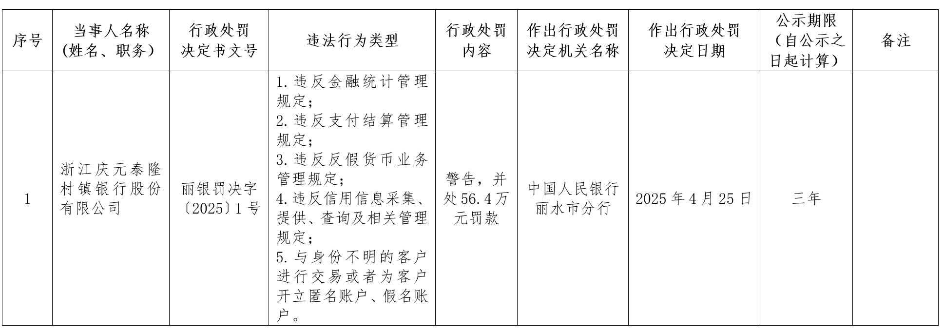 5月7日,中国人民银行丽水市分行行政处罚信息公示表显示,浙江庆元泰隆村镇银行股份有限公司因违反金融统计管理规定,支付结算管理规定,反假货币业务管理规定,信用信息采集、提供、查询及相关管理规定,以及与身份不明的客户进行交易或为客户开立匿名账户、假名账户等五项违法行为,被警告并罚款56.4万元。