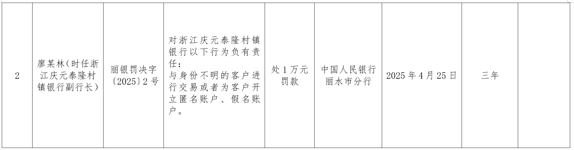 廖某林(时任浙江庆元泰隆村镇银行副行长)对浙江庆元泰隆村镇银行与身份不明的客户进行交易或者为客户开立匿名账户、假名账户负有责任,被处1万元罚款。