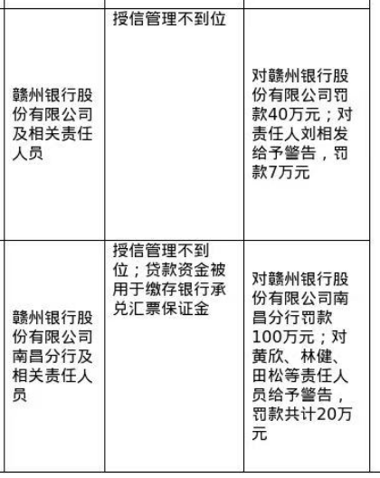此外,赣州银行股份有限公司南昌分行的违法违规事实包括:授信管理不到位,贷款资金被用于缴存银行承兑汇票保证金,因此被罚款100万元。相关责任人黄欣、林健、田松等被给予警告并罚款共计20万元。