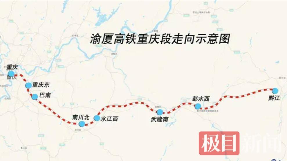 该段是国家《中长期铁路网规划》“八纵八横”中渝厦通道的重要组成部分,从重庆站引出,经渝中、南岸、巴南、南川、武隆、彭水等区县,止于重庆市黔江区,设计时速350公里,全长约250公里,设7座车站。