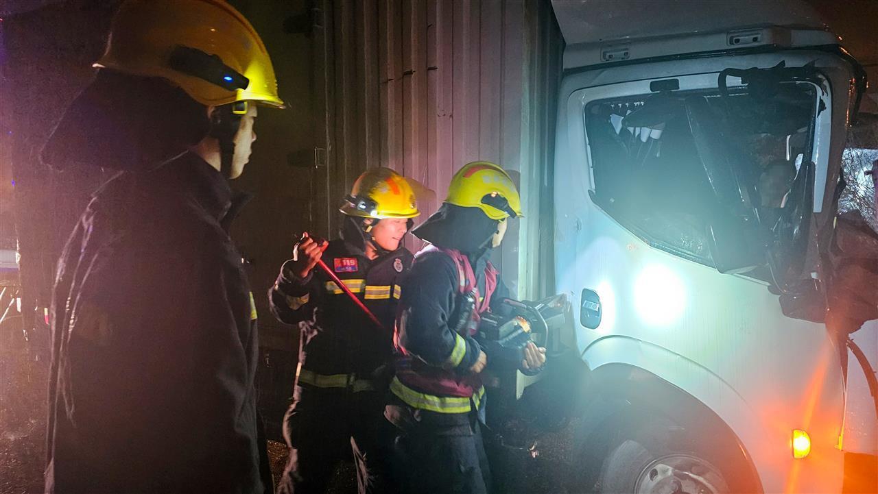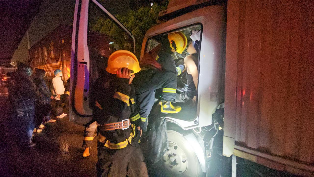 原标题:雨夜两货车追尾一驾驶员被困,消防员紧急破拆营救
