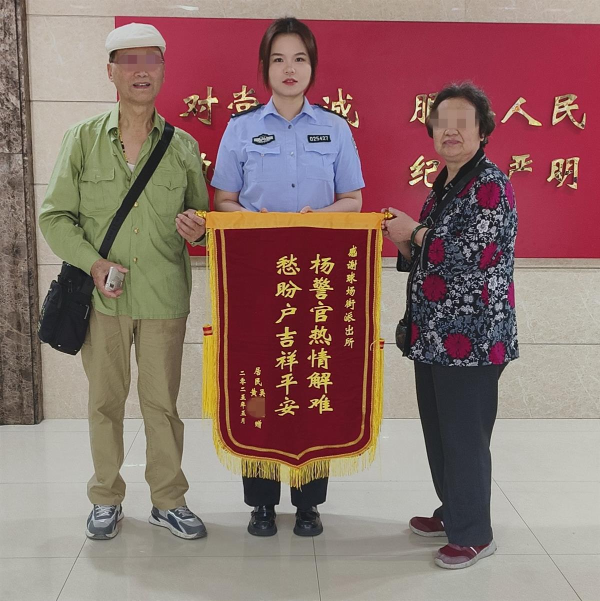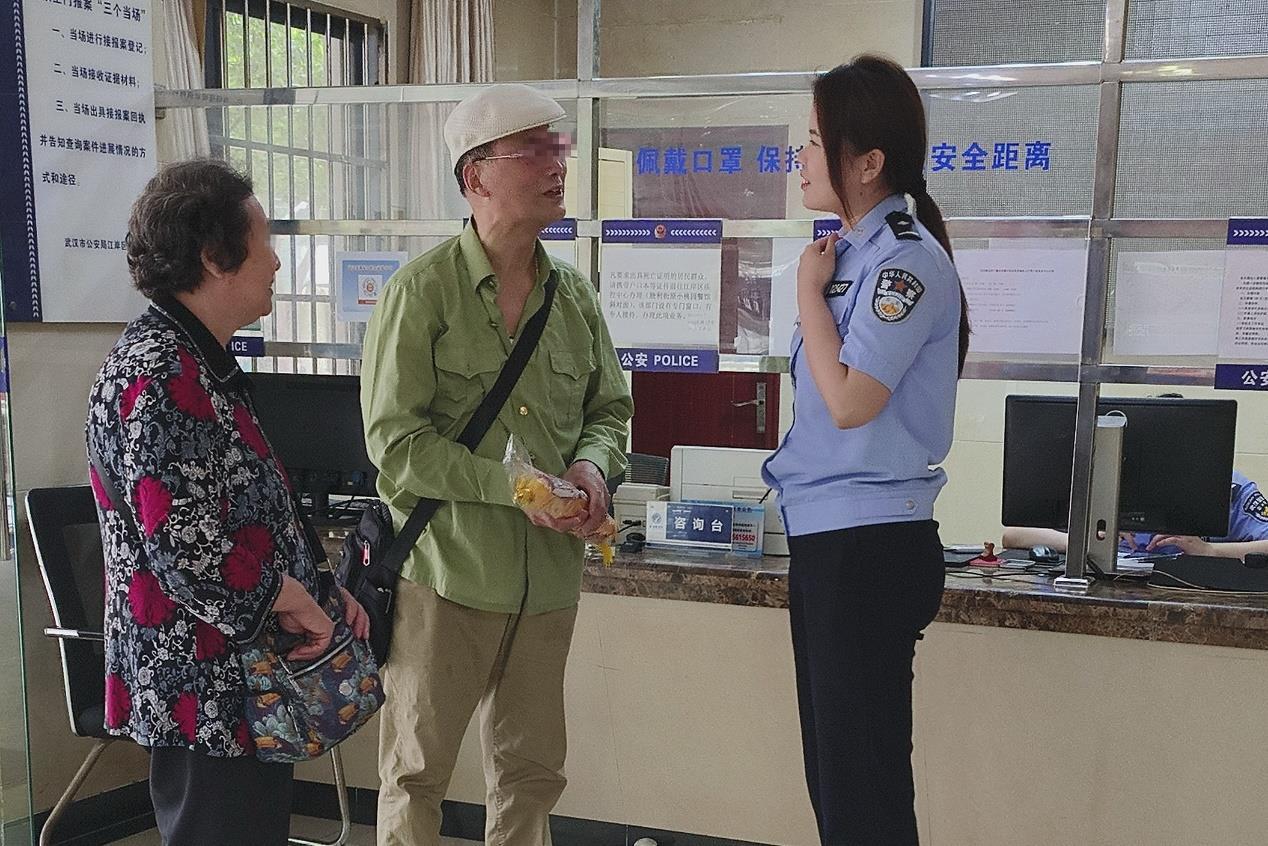 5月27日,两位老人回到武汉后,来到武汉市公安局江岸区分局球场街派出所赠送锦旗,感谢民警帮他们找到了失联14年的儿子。