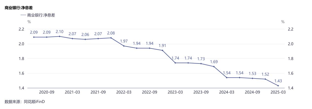 国家金融监管总局数据显示,2024年四季度末,商业银行净息差为1.52%,环比略降1BP,全年净息差较2023年下降17BP,处于历史低位。值得注意的是,2025年一季度末,净息差进一步下探至1.43%,创历史新低。