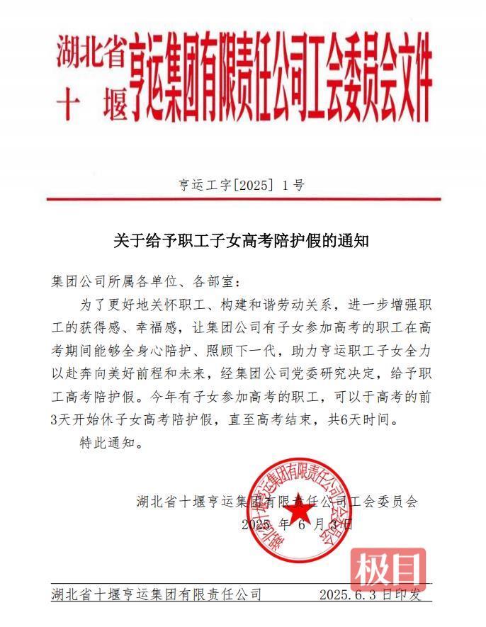 极目新闻记者了解到,湖北省十堰亨运集团有限公司工会6月3日印发通知,给予子女参加高考的职工6天陪护假,且为带薪假期,从高考前3天开始,至高考结束。